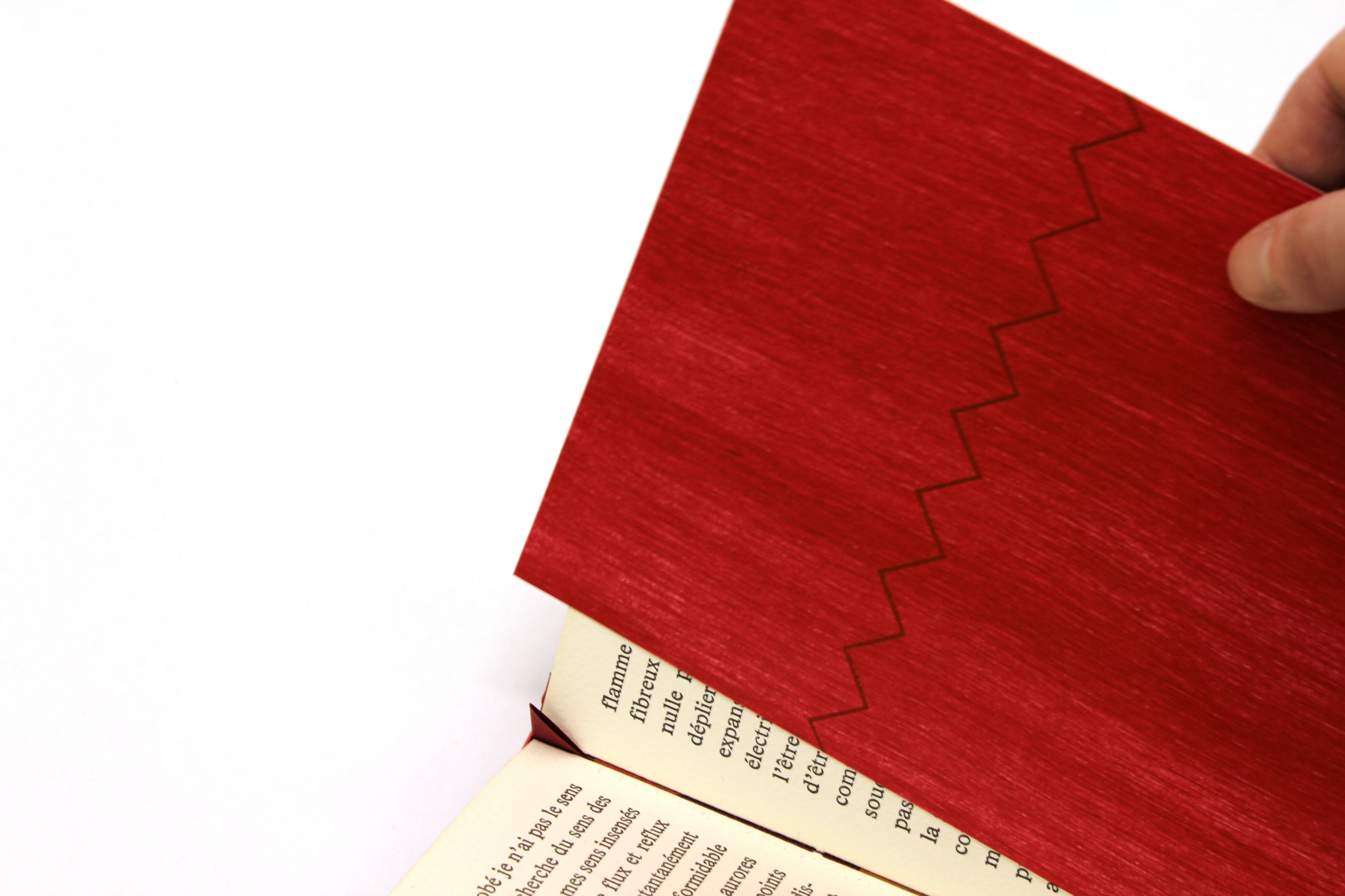 Cette technique date de 2018, dans sa forme définitive et une première version a été réalisée en 2014, sur un livre relié pour la médiathèque de Riom. Tout est né des contraintes imposées par l’ouvrage en question, « L’instant du Givre », dont les textes d’Hélène Cadou étaient imprimés sur des feuillets, tandis que les illustrations de René Bonargent étaient réalisées sur des feuilles simples. J’ai créée un système d’onglets pliés en coins, qui tout en maintenant fermement ces planches, permettait de les garder amovibles. J’ai ensuite dû trouver un système pour relier cet ouvrage monté sur onglets, sans l’endosser. Ainsi est né le système « obi-ori-domé », des rubans noués.