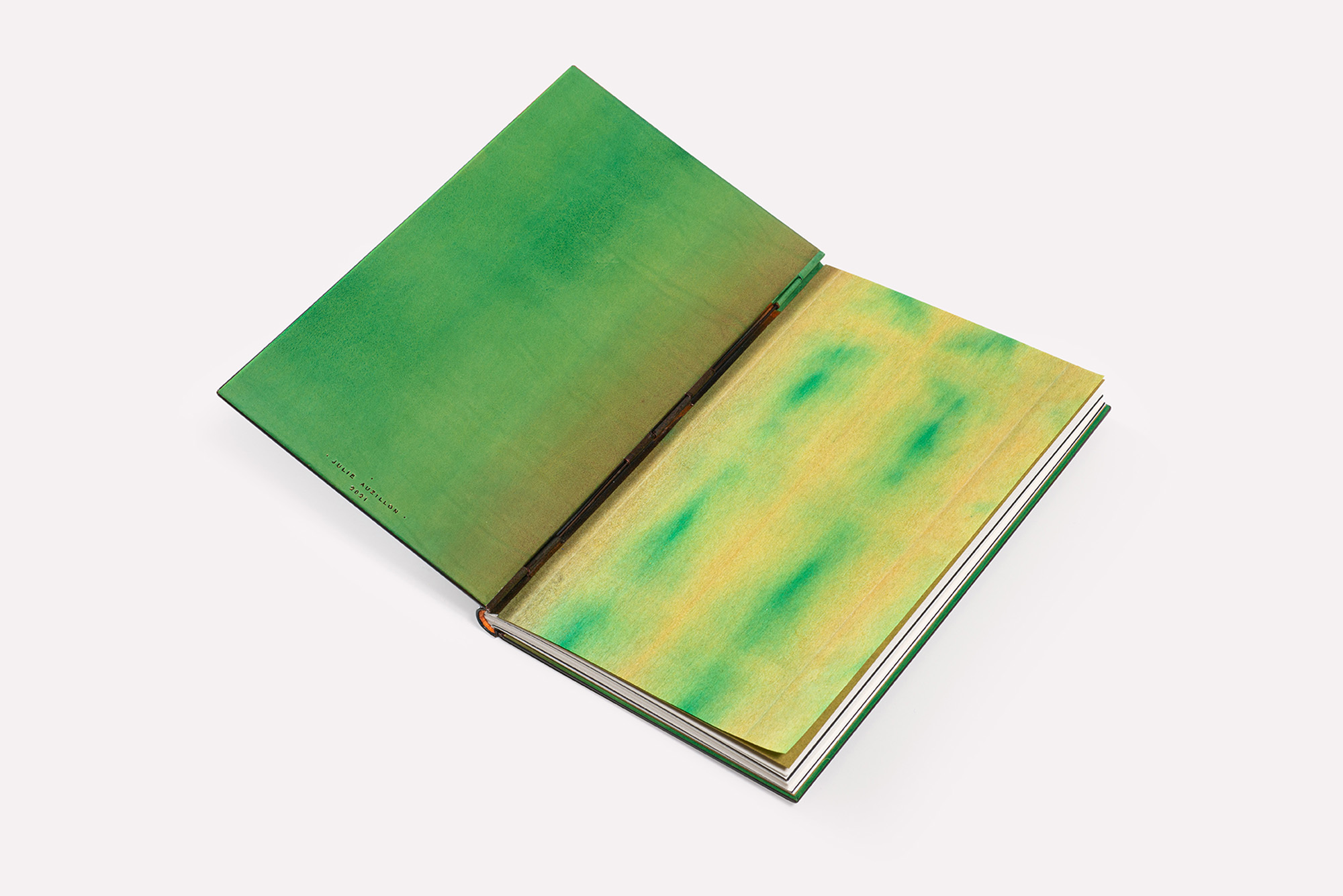 Reliure doublée à tiges : plein veau naturel, décor à l’encre, dominante de brun riche de reflets orangés et bleutés et à l’effet patiné, avec en tête un bandeau de couleurs dégradées se poursuivant d’un plat à l’autre, allant du violet à l’orange, en passant par le vert, tiges de titane brunes assorties, doublures bords à bords en cuir avec un dégradé de vert pomme au vert kaki, assorties aux doubles gardes volantes, les premières en papier vietnamien spécialement décoré à l’encre par la relieuse, les deuxièmes en papier japonais assorti, dos long titré.
