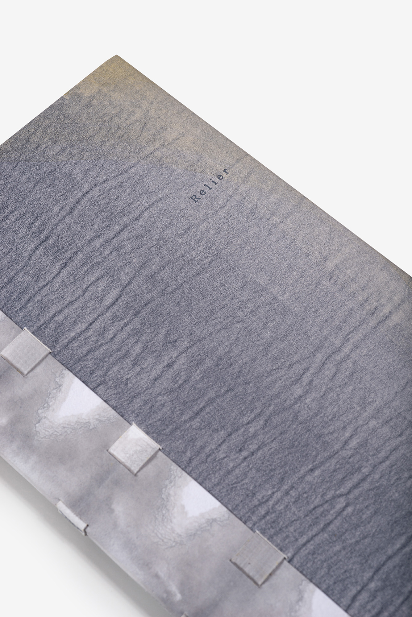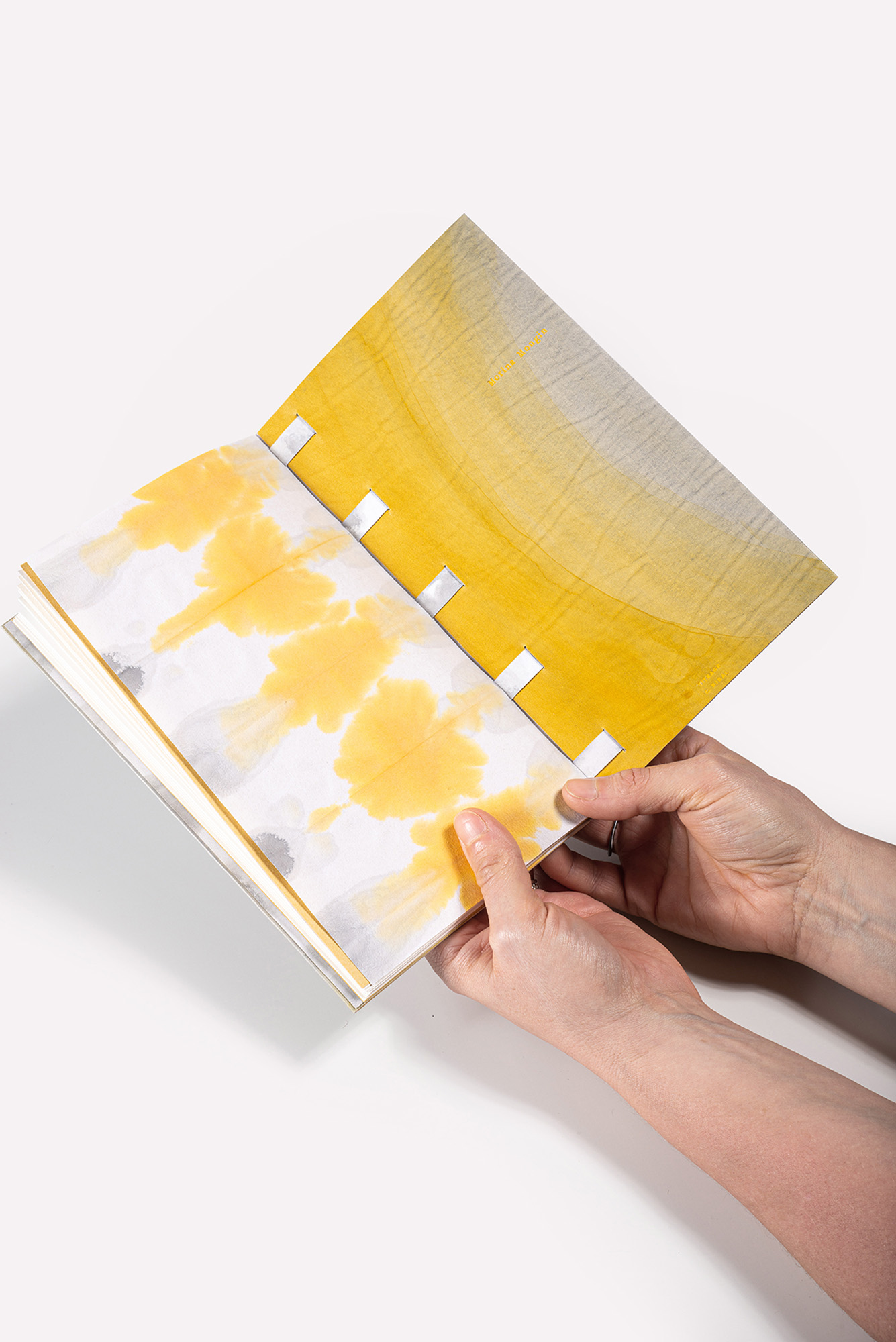 Reliure Origata : veau aniline blanc et papier japonais, décor de dégradés colorés peints à l’encre, nuances allant du gris au jaune d’or, décor se poursuivant sur les contres-plats, gardes volantes en papier japonais spécialement décoré à l’encre par la relieuse, rubans en papier gauffré ton sur ton, titre sur le plat avant se poursuivant sur le contre-plat.