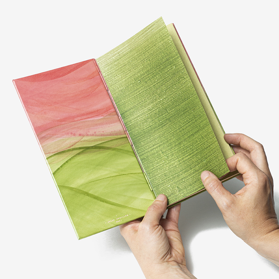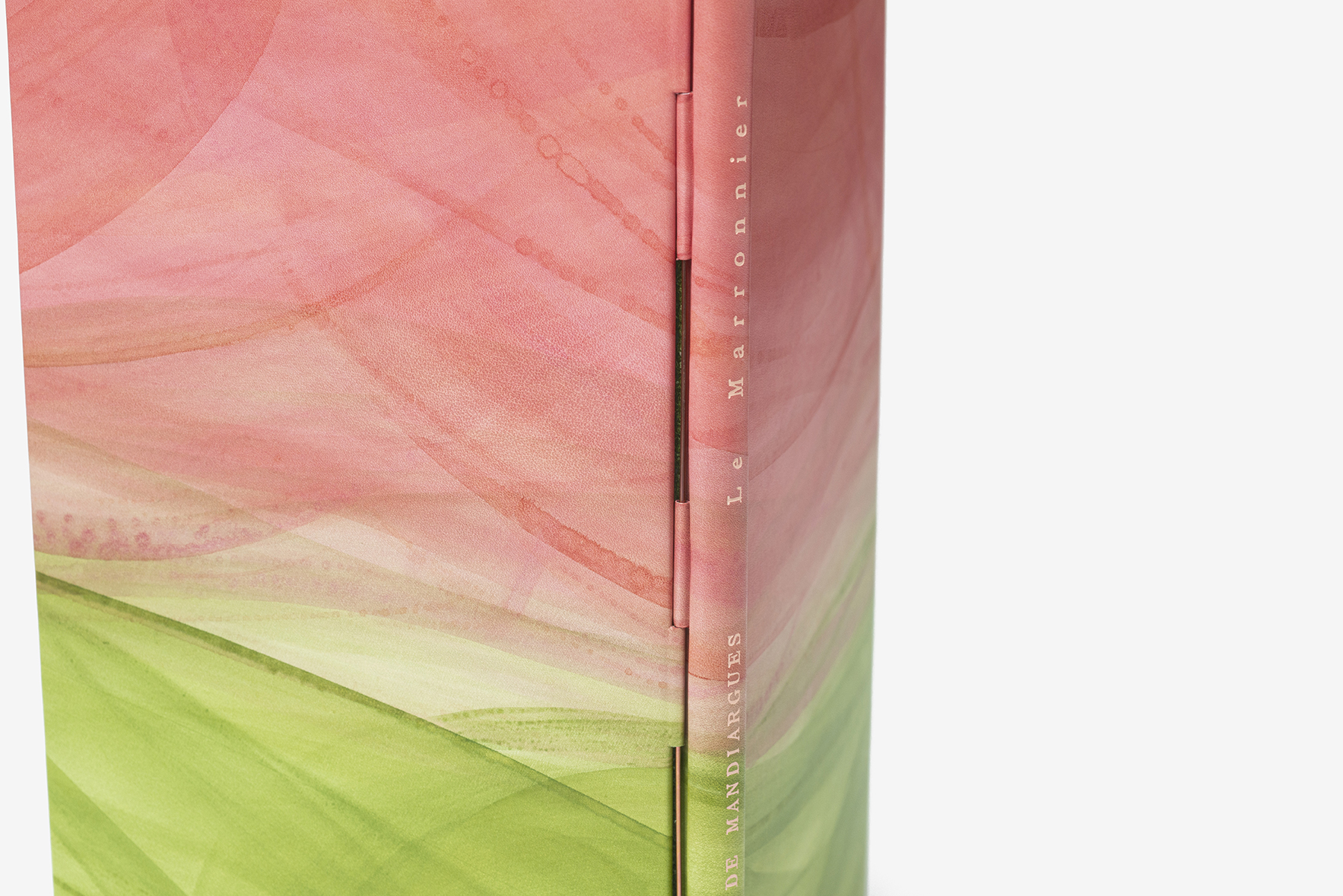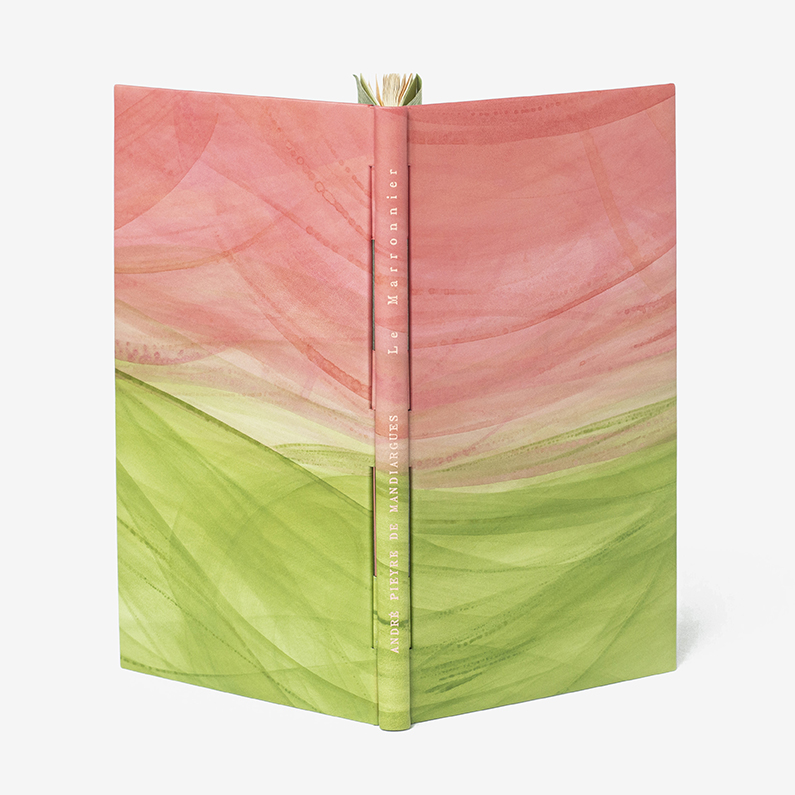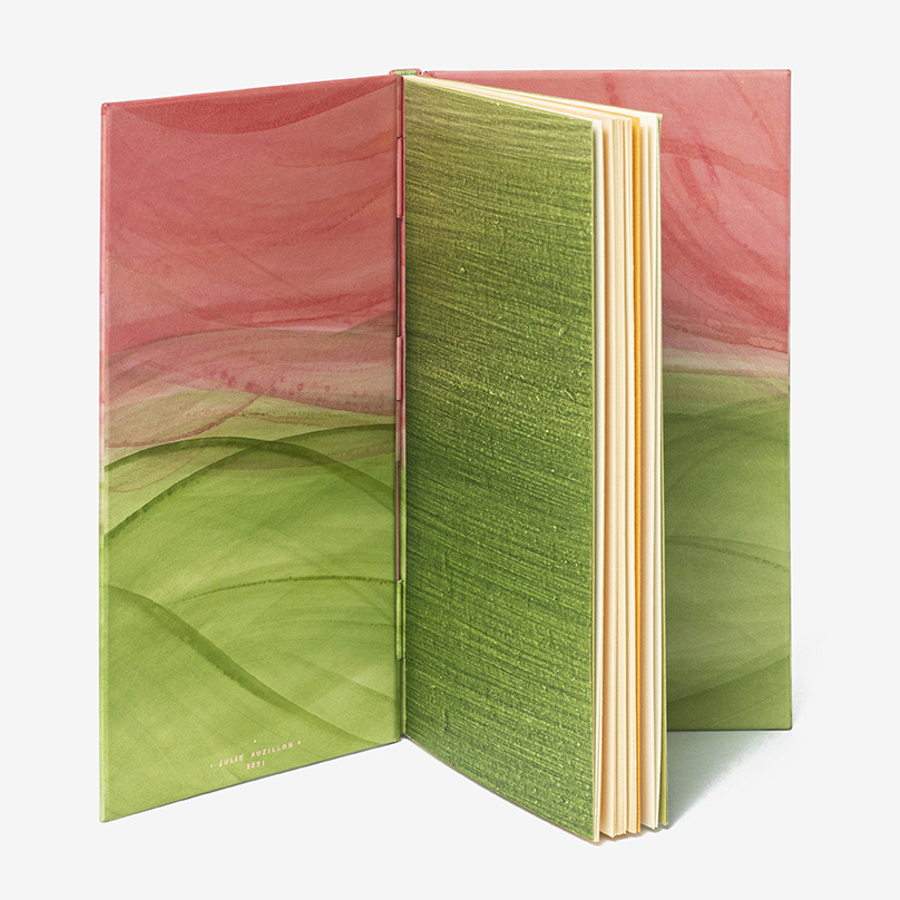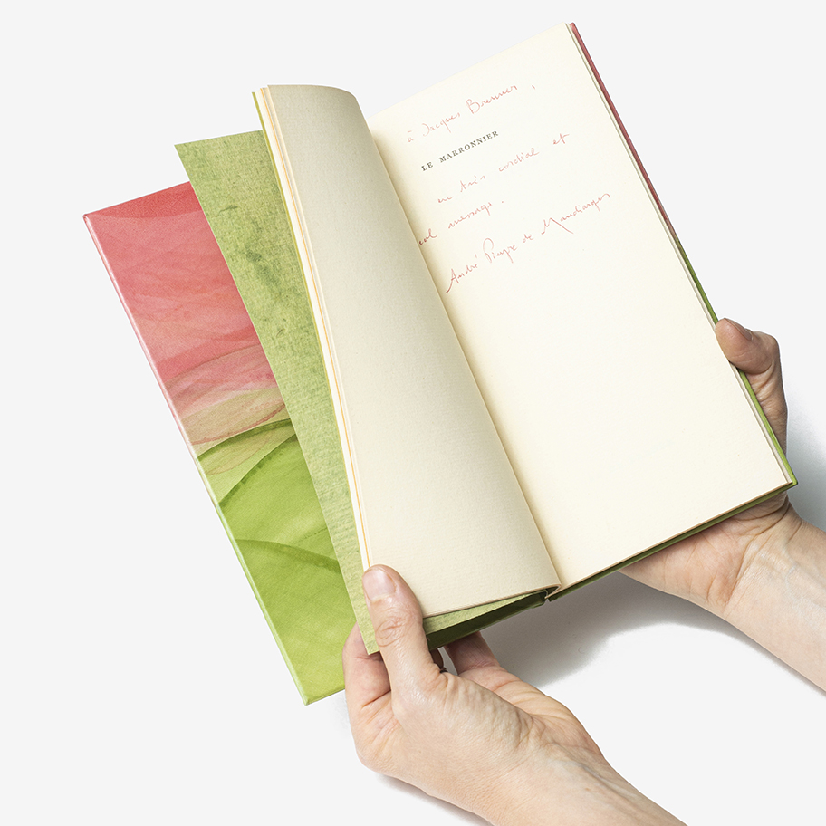 120 x 215 mm. Reliure à tiges, veau aniline blanc, décor à l’encre en nuances de vert et de rose se prolongeant sur les doublures, tiges de titane rose, gardes de papier vietnamien décoré à l’encre. Titrage en long sur le dos de Claude Ribal (2021).