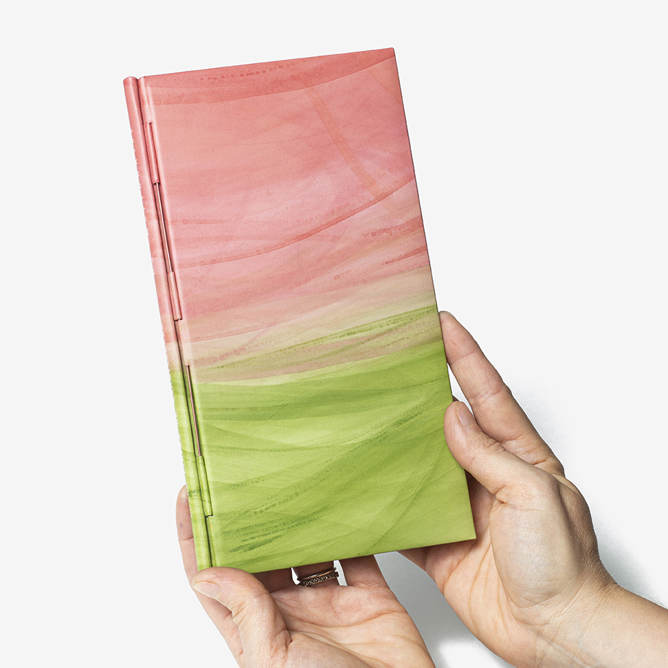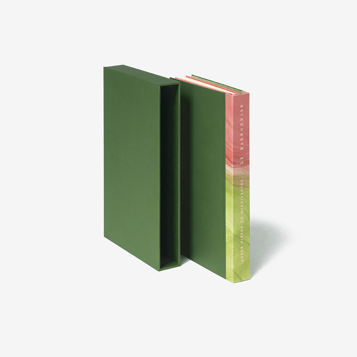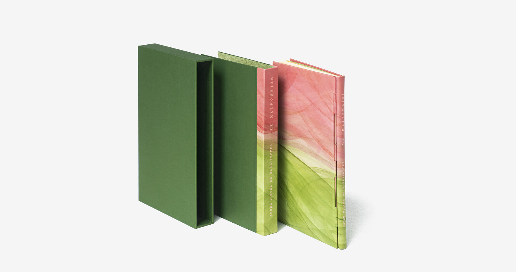 120 x 215 mm. Reliure à tiges, veau aniline blanc, décor à l’encre en nuances de vert et de rose se prolongeant sur les doublures, tiges de titane rose, gardes de papier vietnamien décoré à l’encre. Titrage en long sur le dos de Claude Ribal (2021).