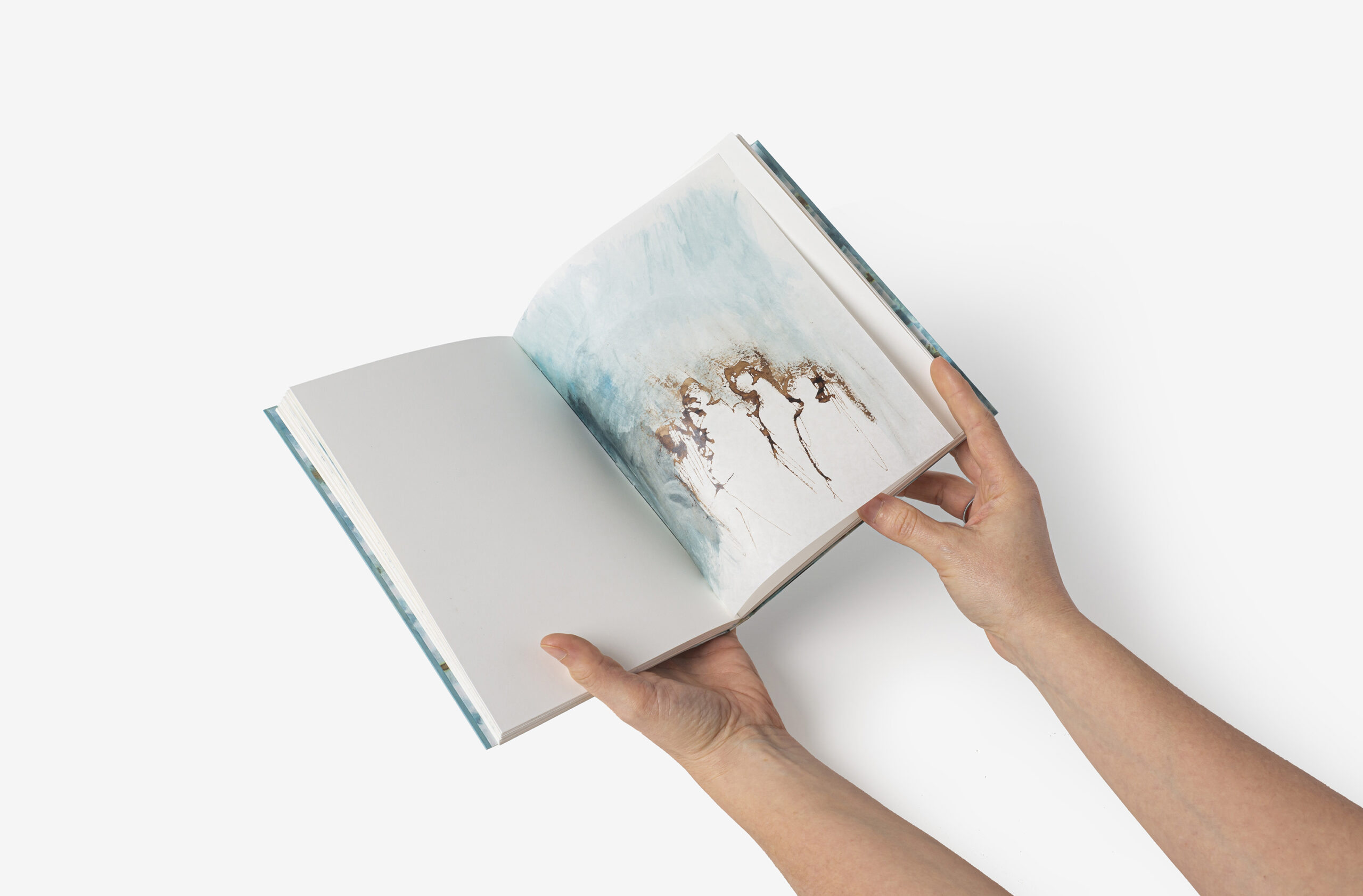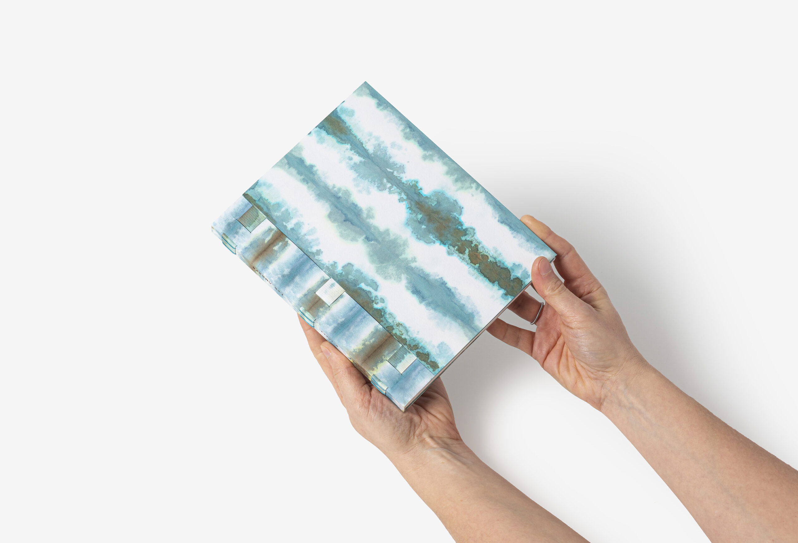 Reliure ORIGATA : papier japonais blanc teinté en nuances de vert, bleu et chocolat, décor se poursuivant sur les contres-plats, pages de gardes assorties, rubans en papier gauffré ton sur ton, titre au film chocolat sur le dos, chemise et étuis souples en papier.
