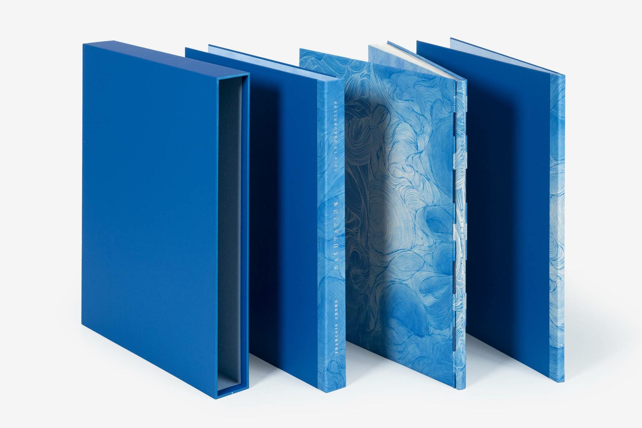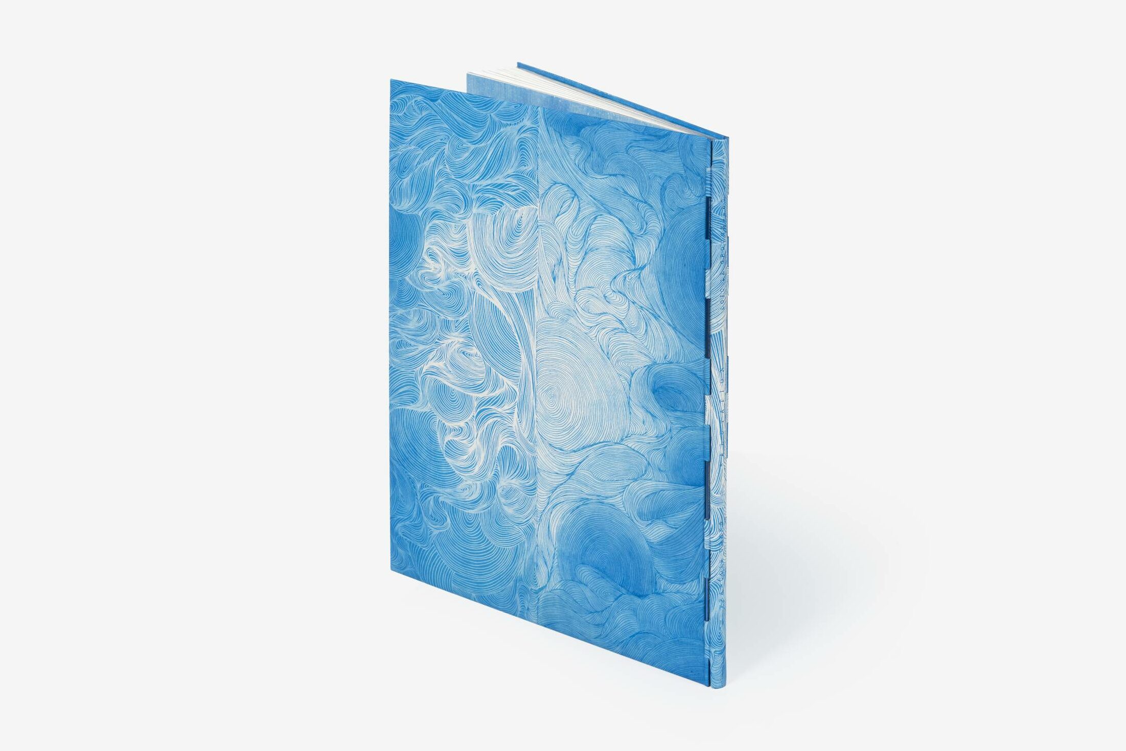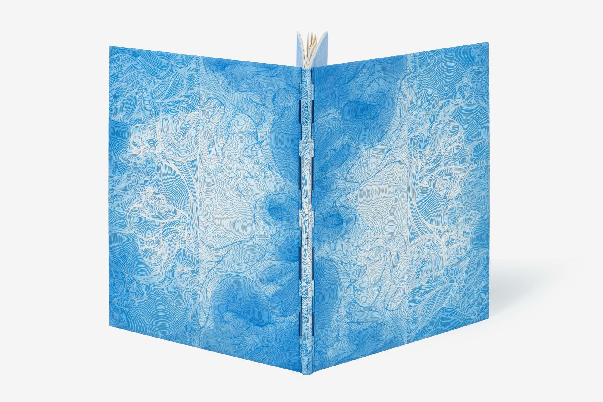 Reliure doublée, à tiges de titane : veau aniline blanc, motif dessiné à la main par la relieuse, puis imprimé en héliogravure par Fanny Boucher, nuées bleues peintes sur le cuir, tiges de titane bleues assorties ; décor se poursuivant sur les doublures bords à bords, gardes volantes en papier vietnamien écru rayé de lignes blanches irisées ; titrage en long sur le dos ; tranche de tête dorée sur témoins à l’or blanc par Jean-Luc Bongrain ; chemise rigide décorée et titrée sur le dos, étui ; fragment original de la matrice de l’héliogravure, encrée et laquée, en chemise séparée.