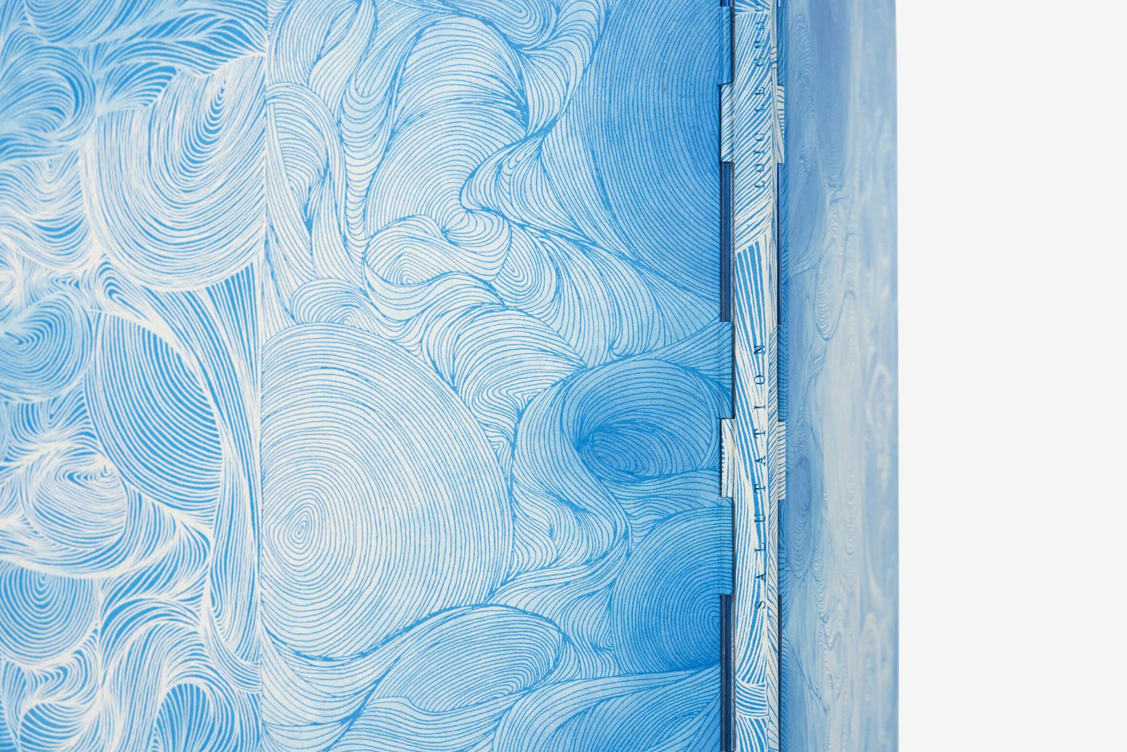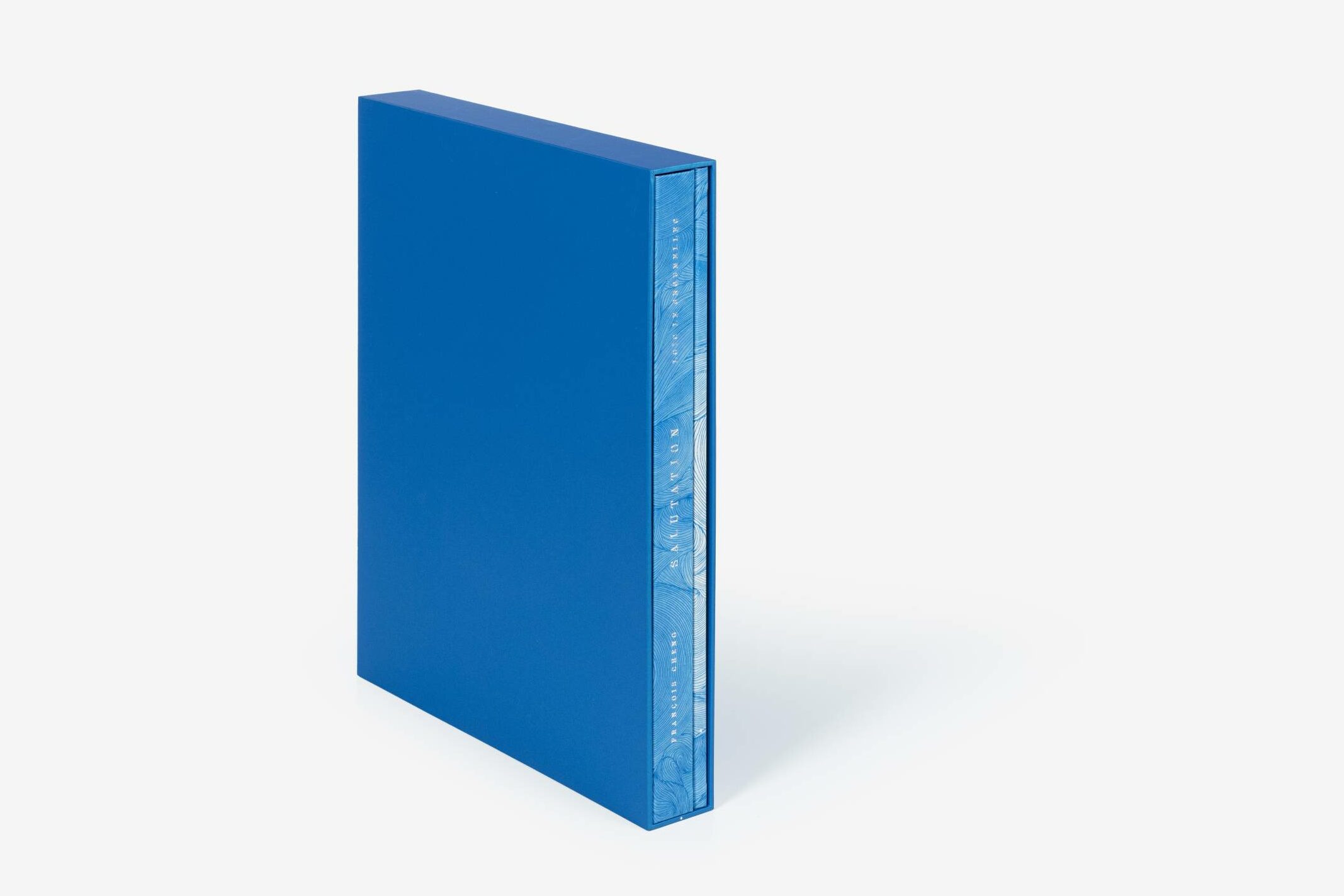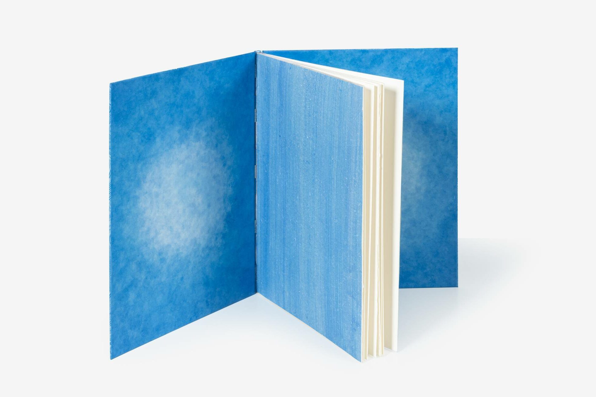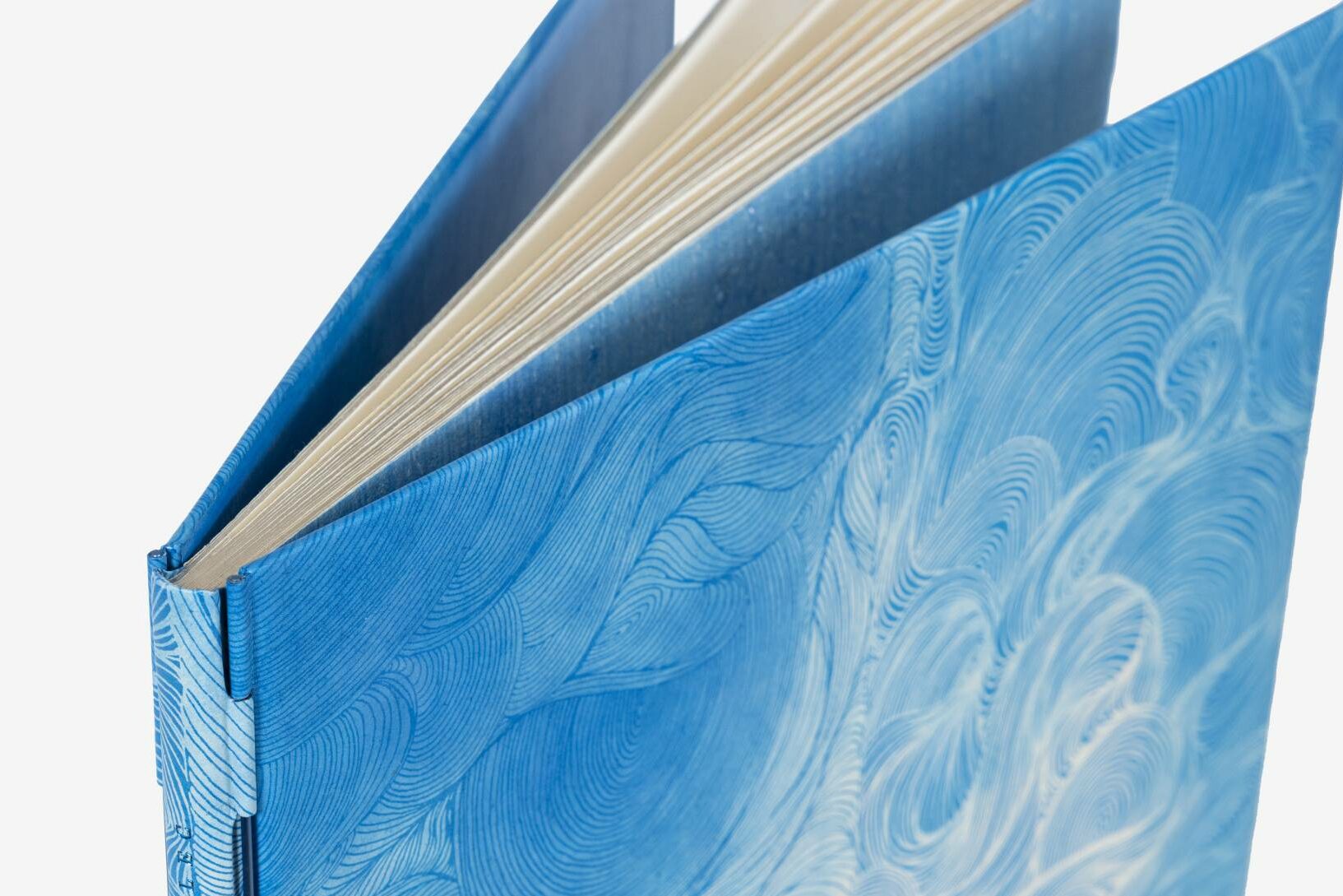 Reliure doublée, à tiges de titane : veau aniline blanc, motif dessiné à la main par la relieuse, puis imprimé en héliogravure par Fanny Boucher, nuées bleues peintes sur le cuir, tiges de titane bleues assorties ; décor se poursuivant sur les doublures bords à bords, gardes volantes en papier vietnamien écru rayé de lignes blanches irisées ; titrage en long sur le dos ; tranche de tête dorée sur témoins à l’or blanc par Jean-Luc Bongrain ; chemise rigide décorée et titrée sur le dos, étui ; fragment original de la matrice de l’héliogravure, encrée et laquée, en chemise séparée.