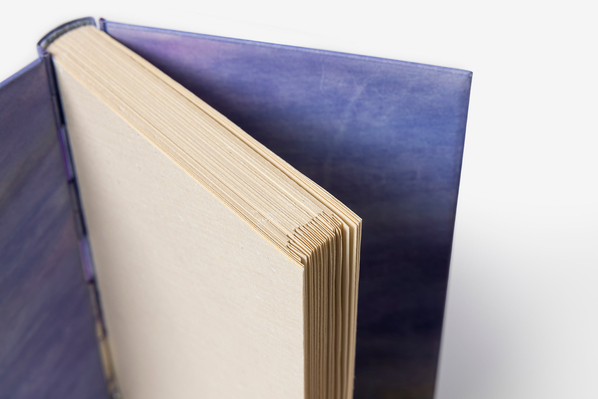 Reliure doublée à tiges : plein veau aniline blanc, décor peint de nuances de violet et de bleu en oblique. Décor se poursuivant sur les doublures bords à bords ; tiges de titane violettes assorties et gardes volantes en papier vietnamien.