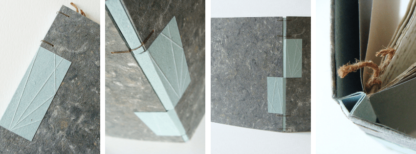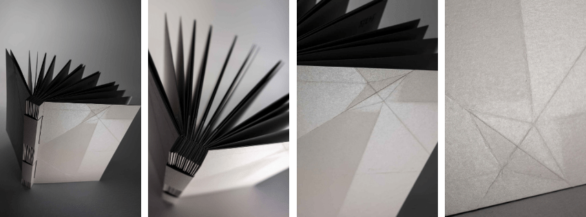 C’est en travaillant sur la reliure de L’Instant du givre d’Hélène Cadou, commande de la médiathèque de Riom en 2018, que, souhaitant évoquer le thème de la trace, j’ai imaginé tirer parti des marques laissées par le pliage du papier, en les considérant comme des compositions graphiques à part entière.