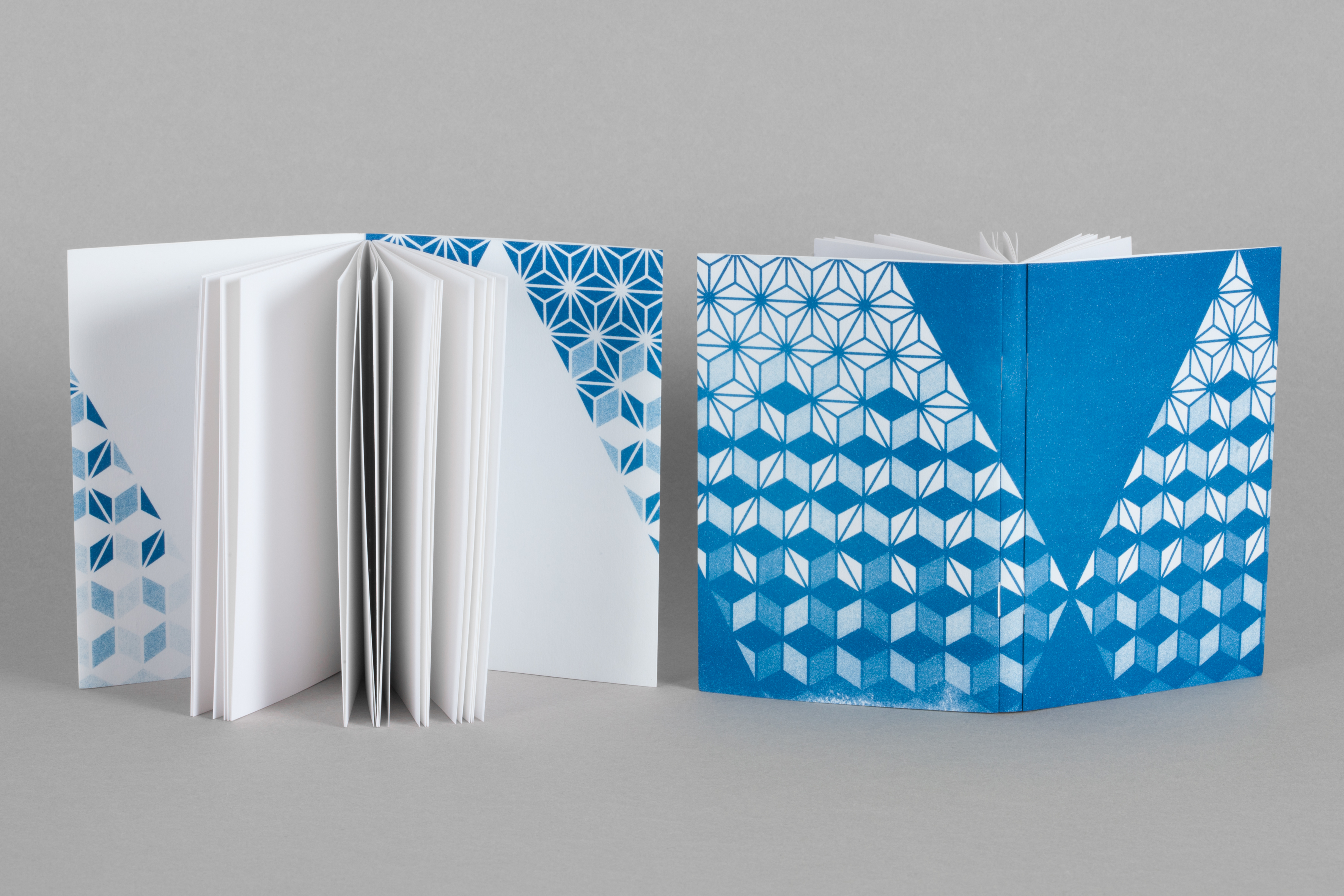 Les couvertures, mises à la verticale, s’entrouvrent et montrent la construction du livre, habituellement cachée. On comprend alors que la couverture est un long bandeau de papier plié. Les motifs se poursuivent jusqu’à l’intérieur du livre. Le motif est réalisé en cyanotype, un procédé photographique monochrome négatif ancien.