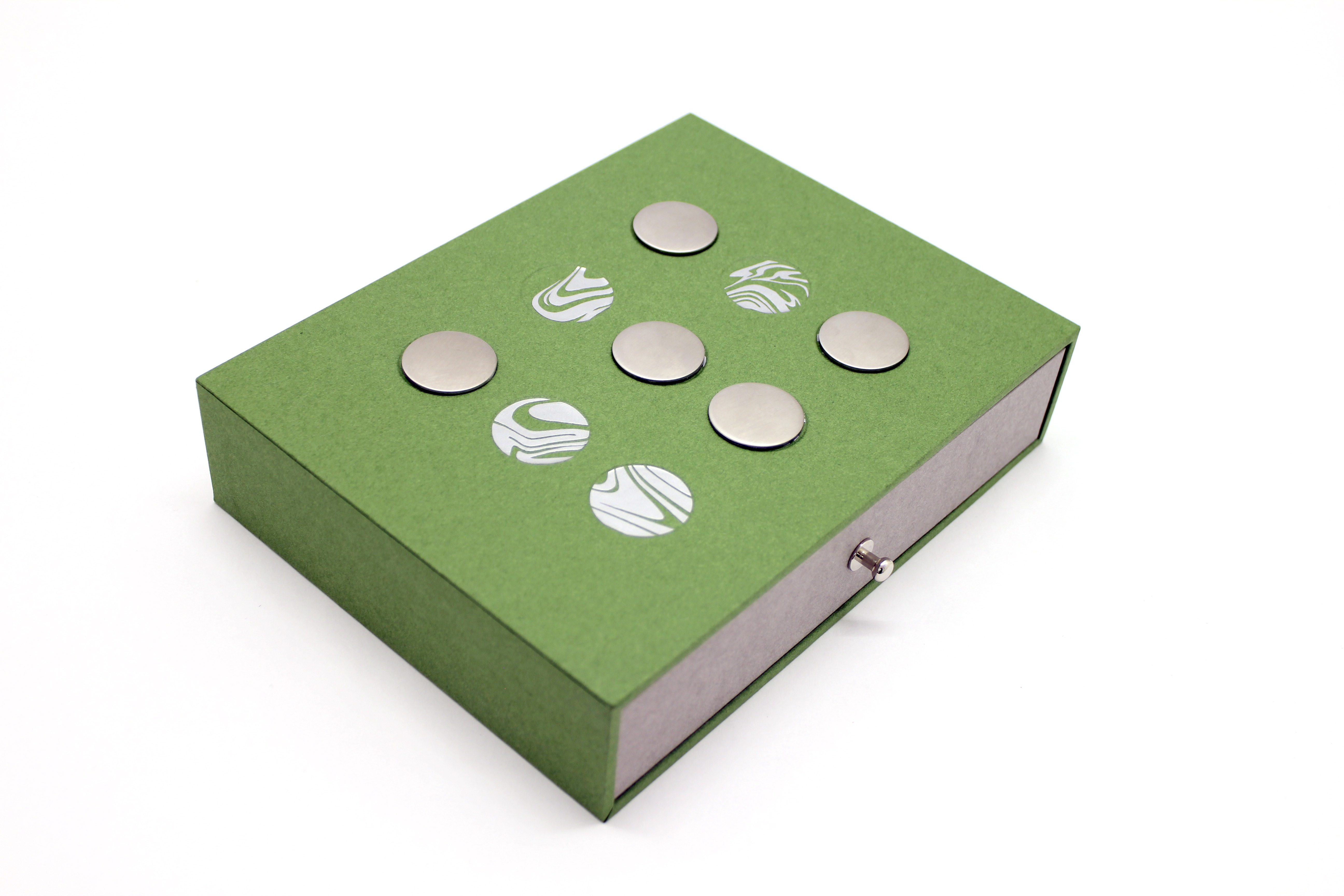 Un coffret aimanté, avec cinq délicates pastilles en acier brossé, que l’on peut déplacer d’un emplacement à l’autre. Ces neufs emplacements en creux, sont marqués de marbrures argentées. L’ouvrage est placé dans un tiroir tapissé de chèvre velours.