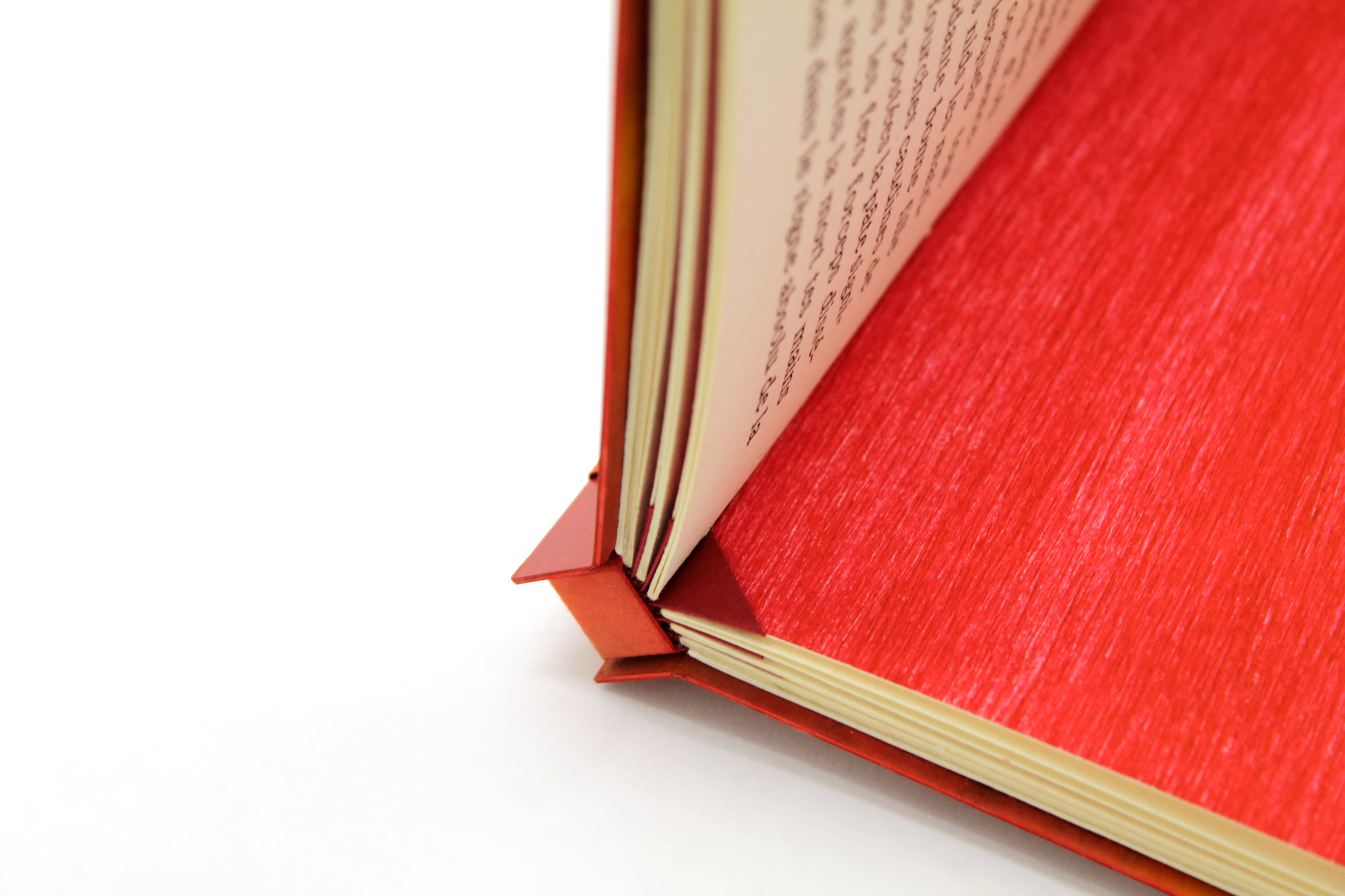 Structure obi-ori-domé (ruban noué), avec couverture repliée rendant visible les contreplats. Cuir rouge carmin marqué d’empreintes d’origata (papier plié), rubans et contreplats en papier coloré à la main dans des tonalités fauves. Lignes de coutures décoratives au fil de lin rouge.