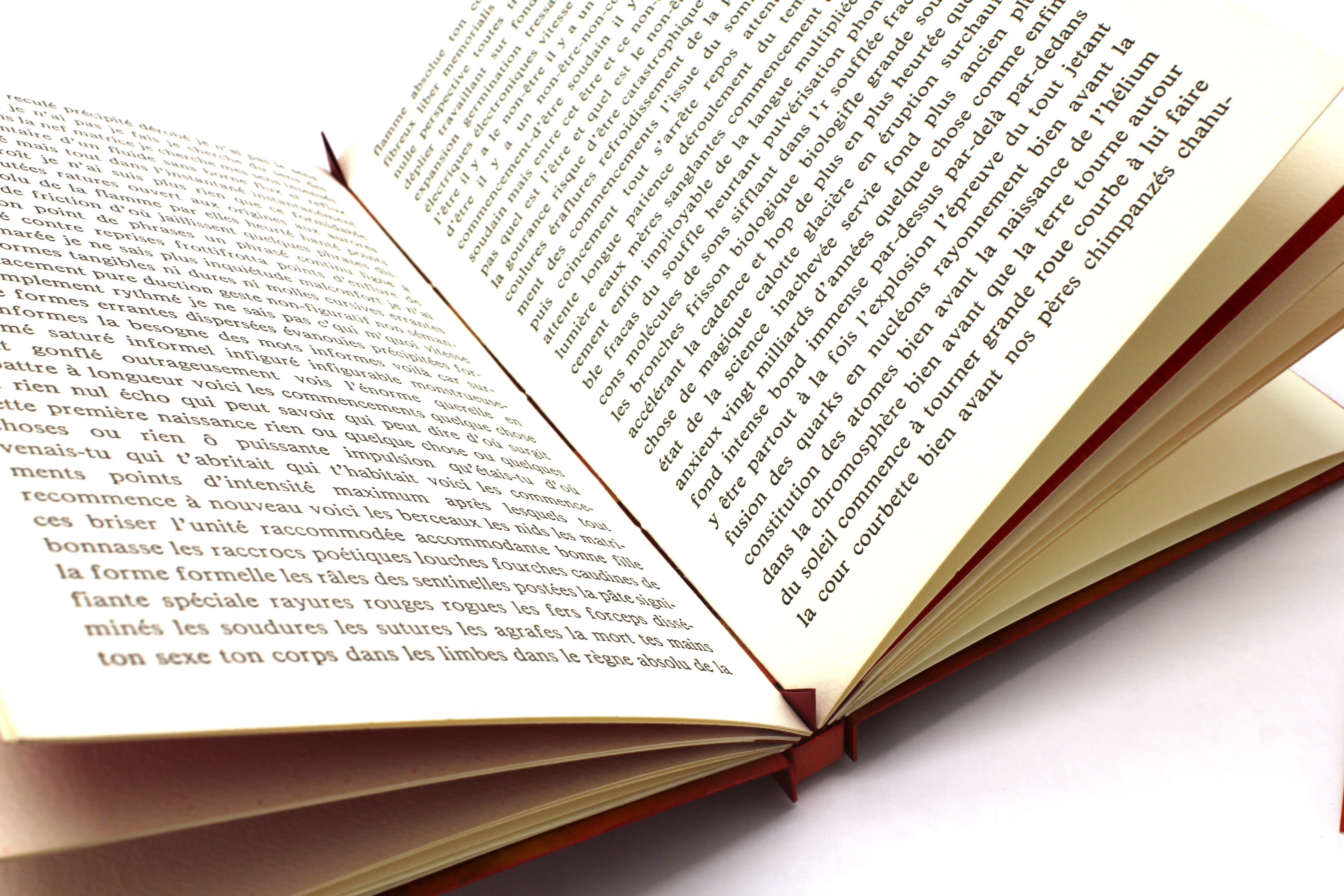 Cette technique date de 2018, dans sa forme définitive et une première version a été réalisée en 2014, sur un livre relié pour la médiathèque de Riom. Tout est né des contraintes imposées par l’ouvrage en question, « L’instant du Givre », dont les textes d’Hélène Cadou étaient imprimés sur des feuillets, tandis que les illustrations de René Bonargent étaient réalisées sur des feuilles simples. J’ai créée un système d’onglets pliés en coins, qui tout en maintenant fermement ces planches, permettait de les garder amovibles. J’ai ensuite dû trouver un système pour relier cet ouvrage monté sur onglets, sans l’endosser. Ainsi est né le système « obi-ori-domé », des rubans noués.