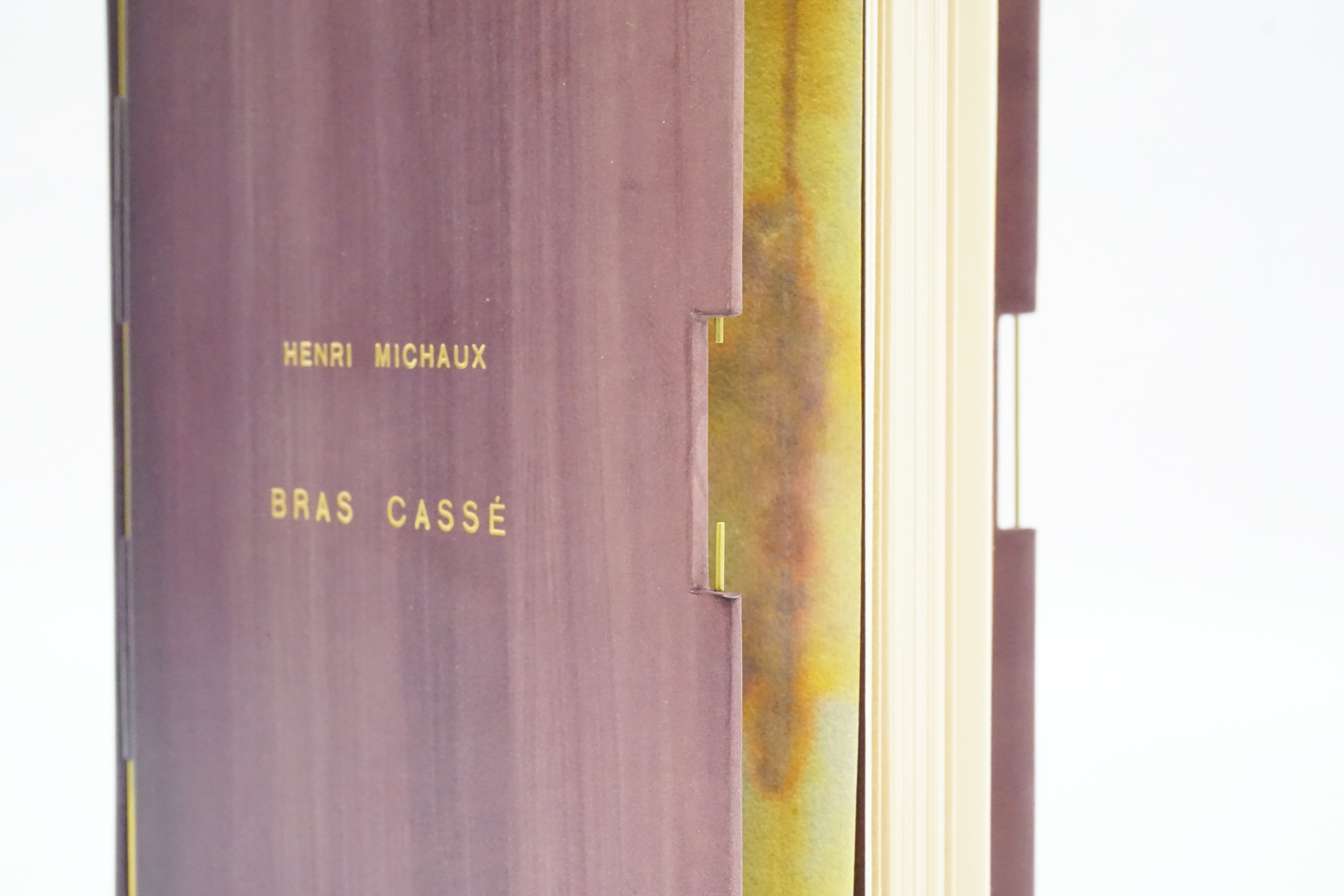Un cuir juste teinté au pinceau d’un doux dégradé de couleur mauve et quelques lignes dorées faites de tiges métalliques ou de lettres pressées à chaud, sur Bras cassé d’Henri Michaux.