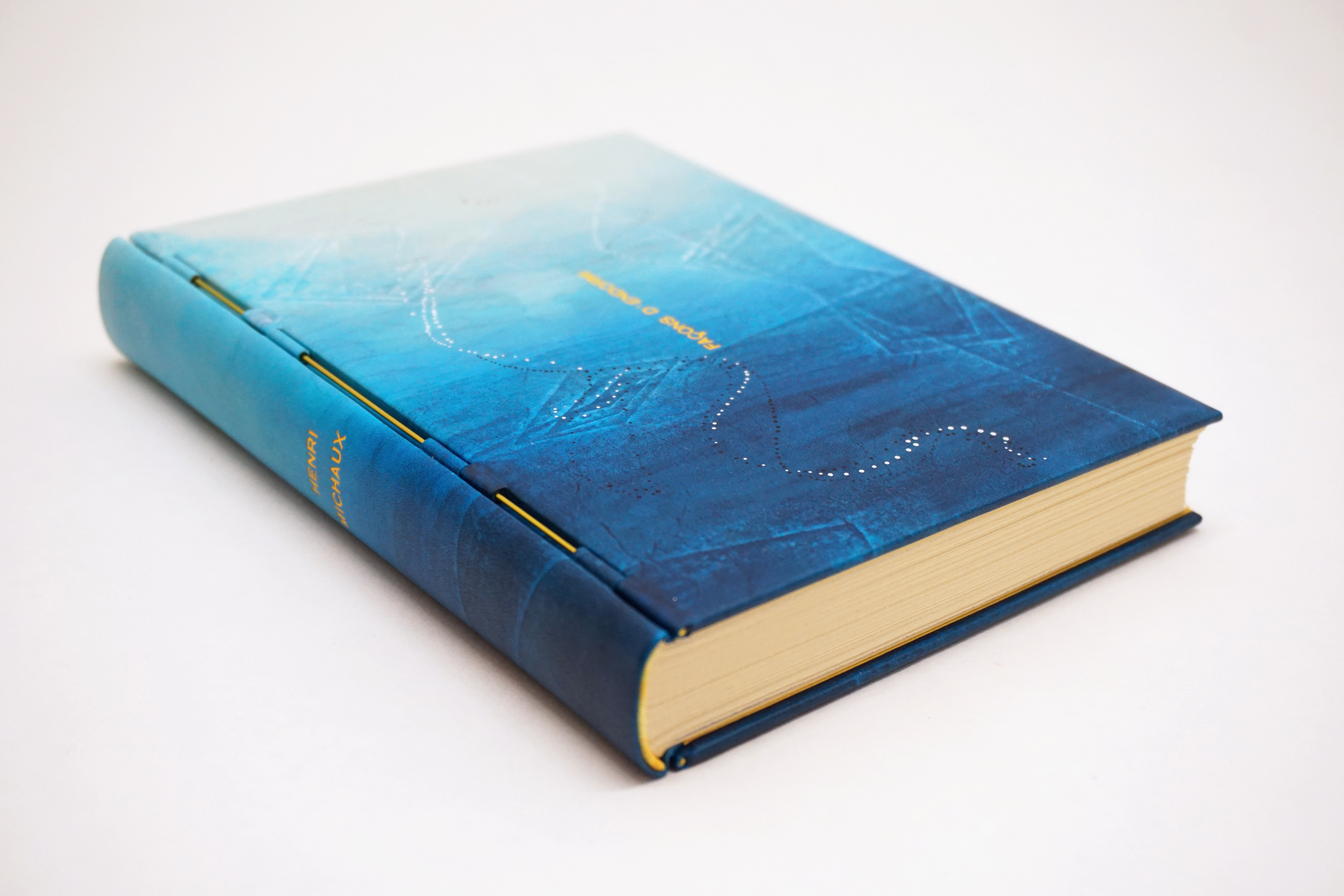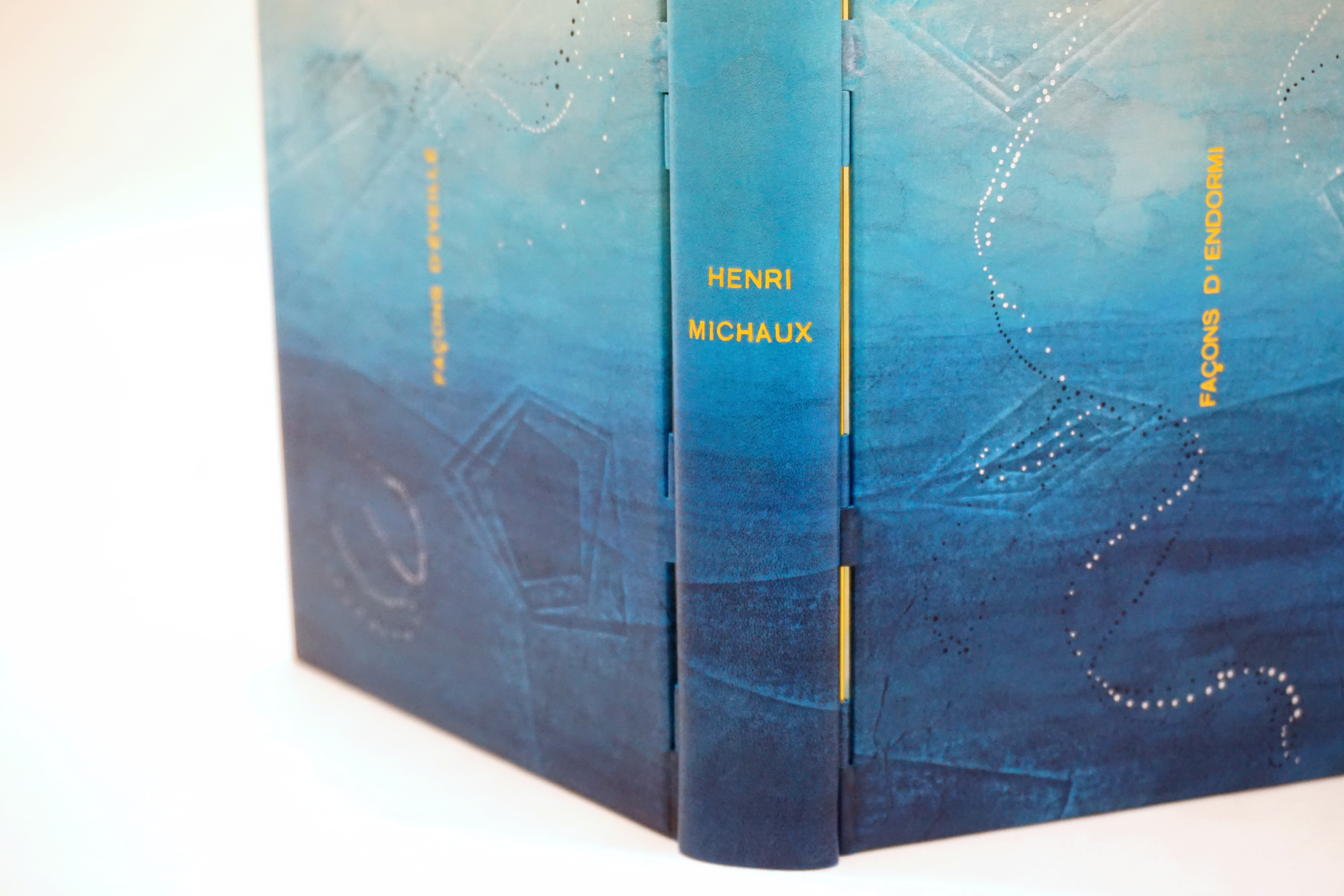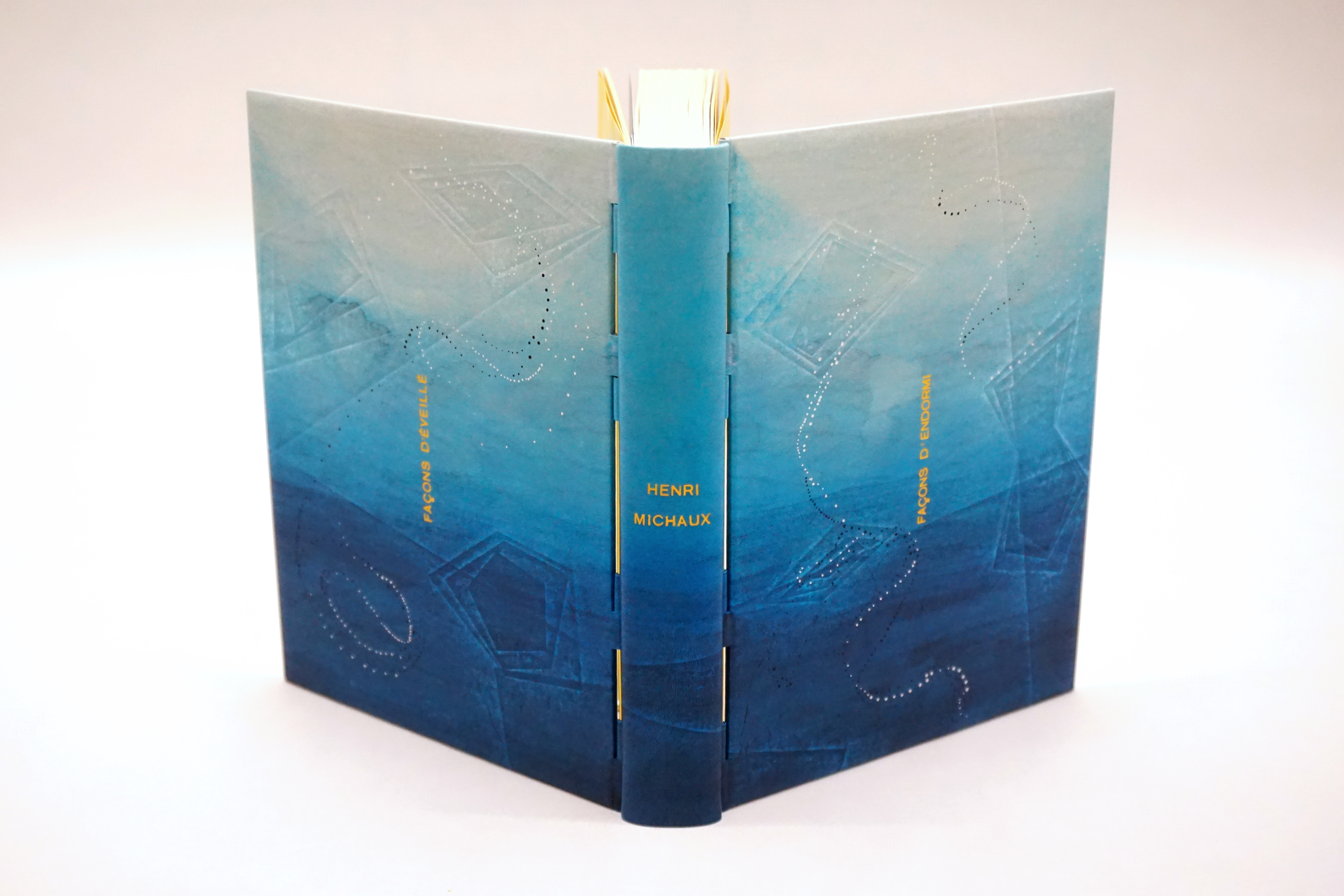 Reliure à tiges apparentes en veau bleu sur Façons d’endormi Façons d’éveillé, de Henri Michaux.