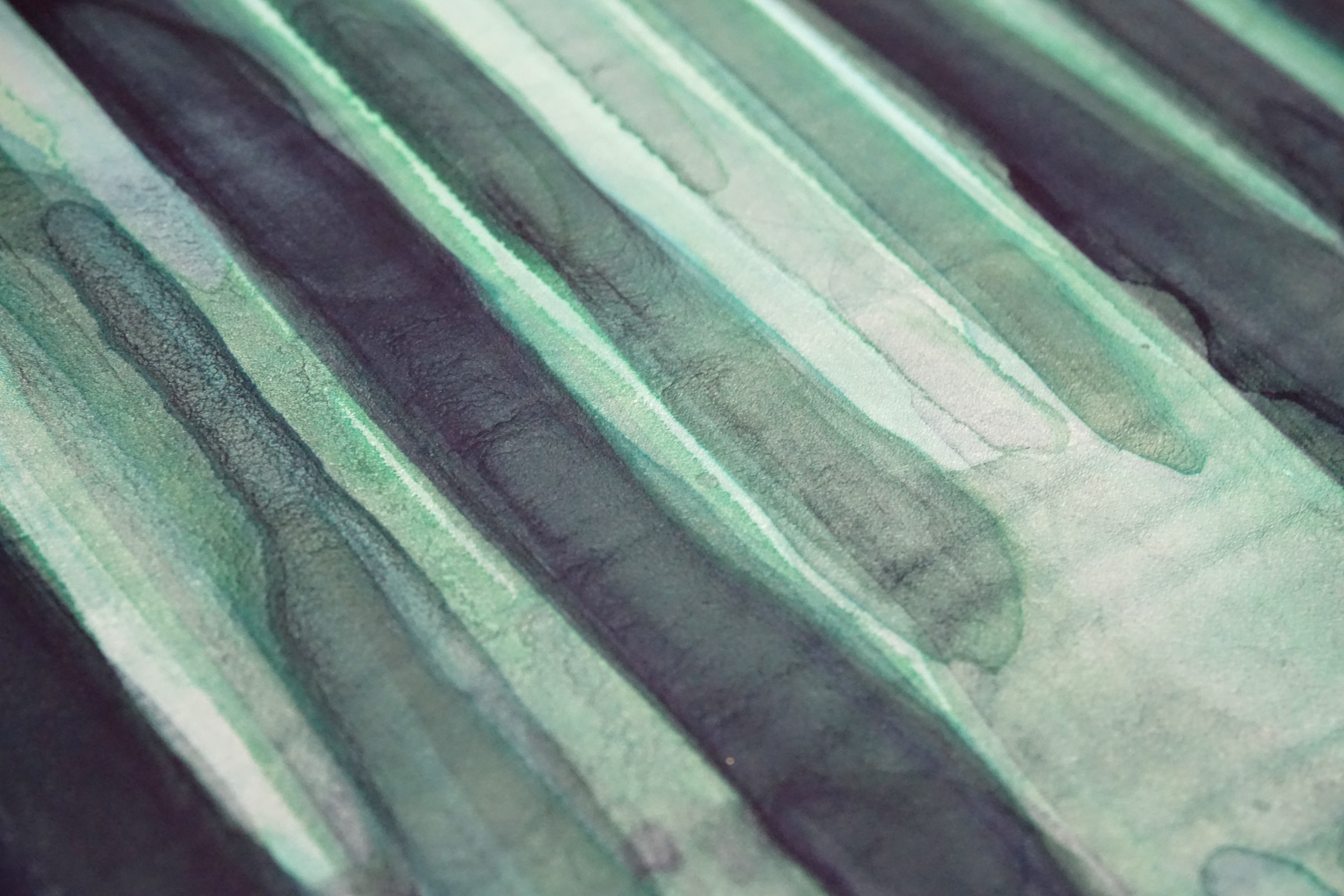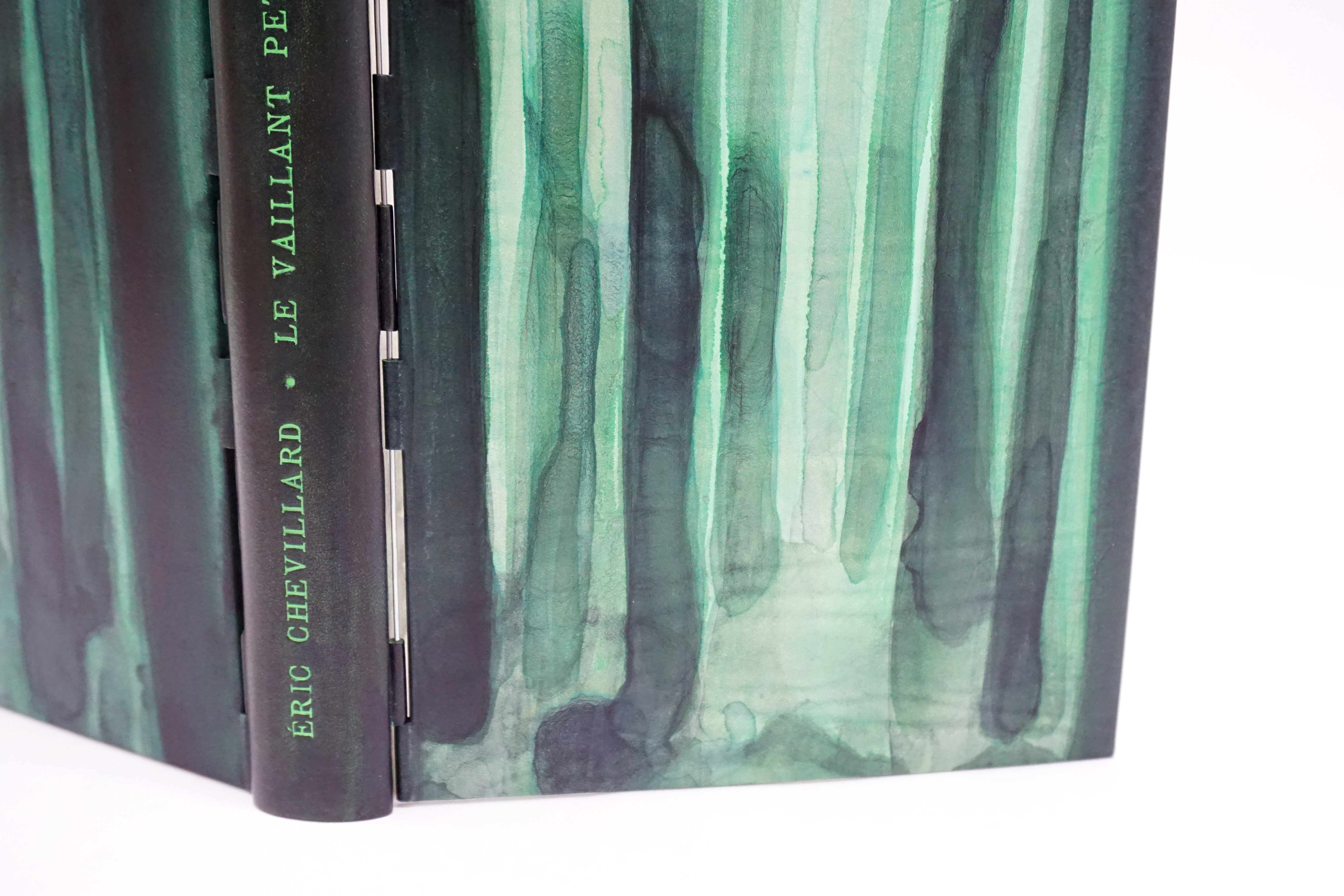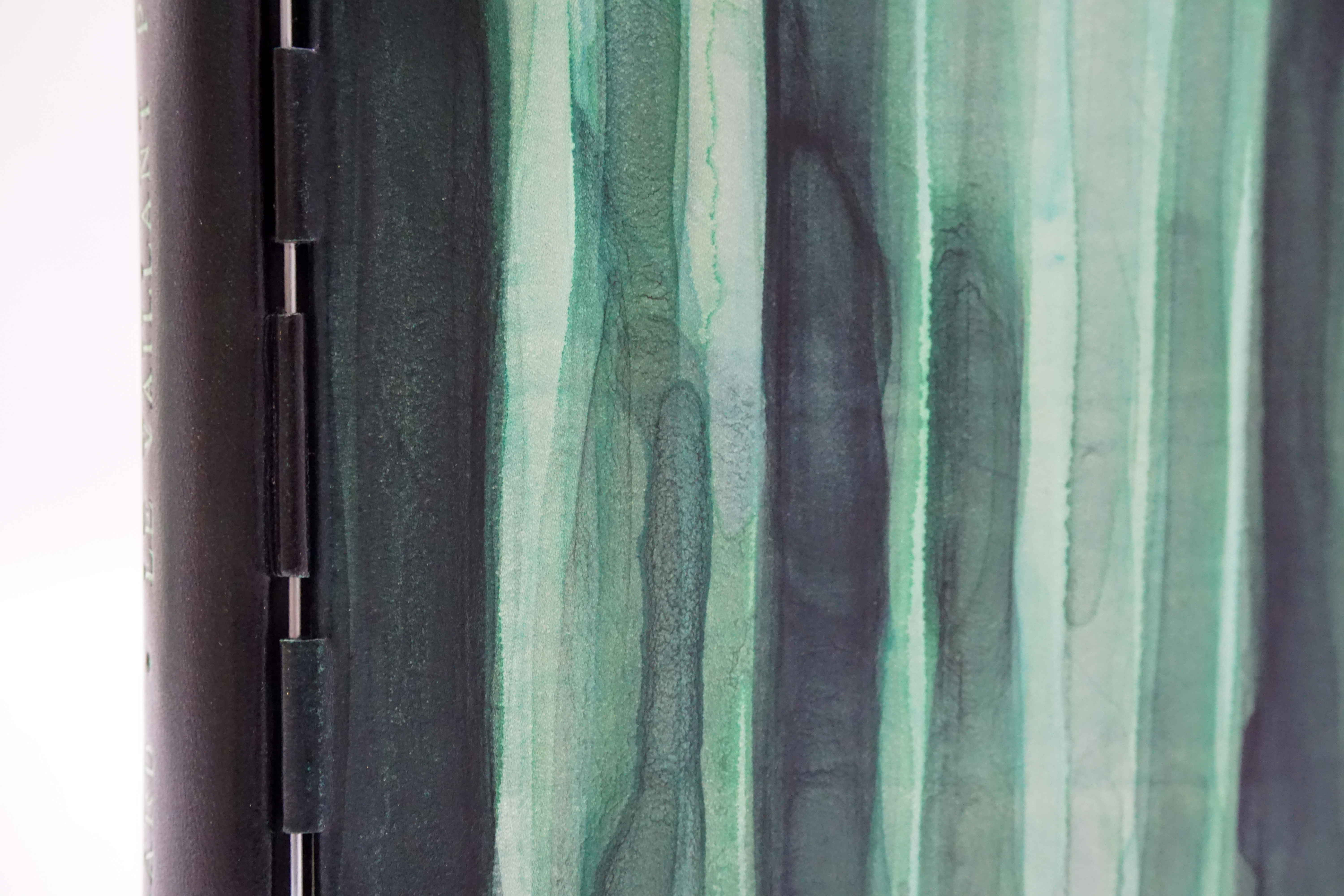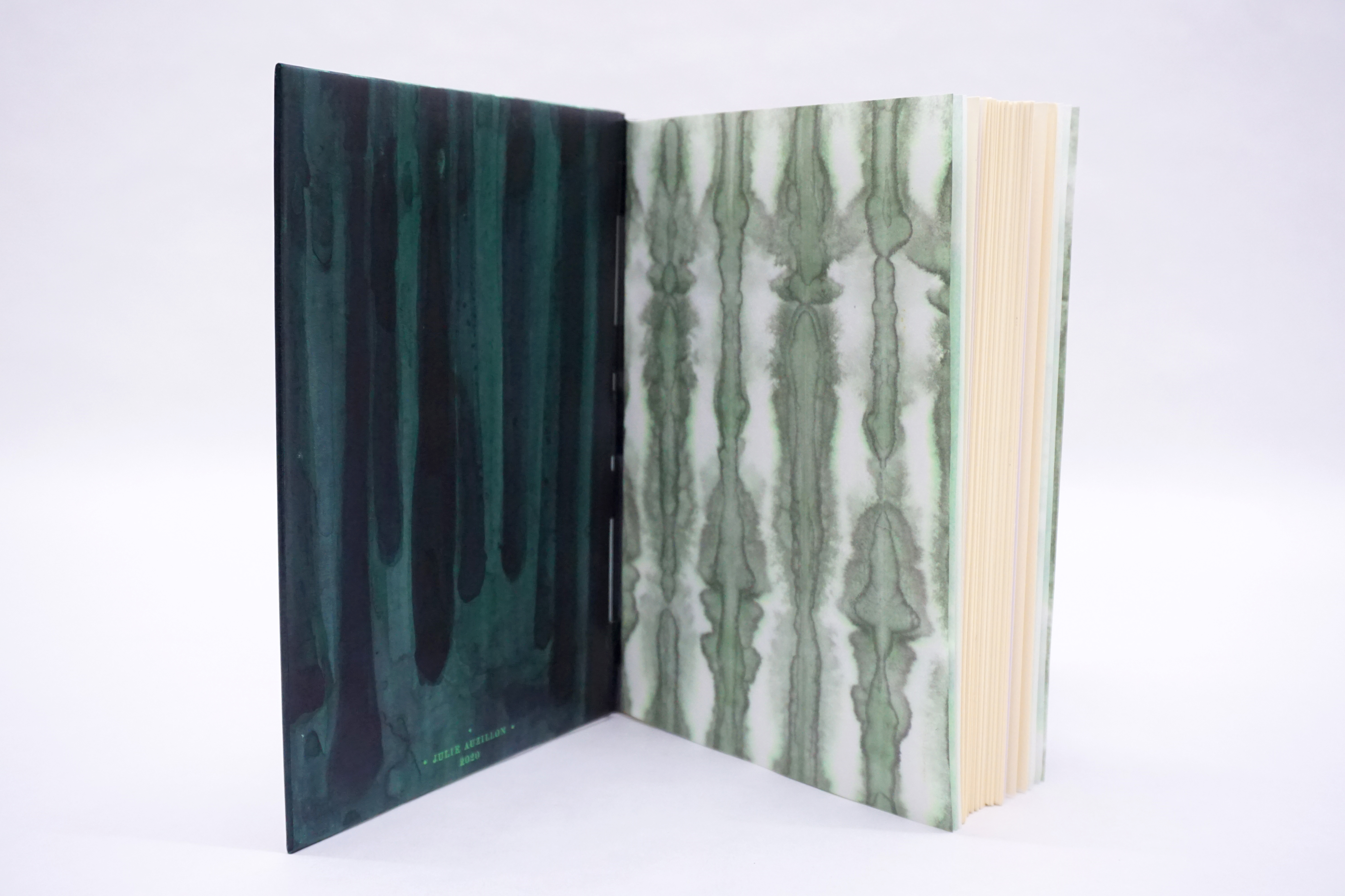 Reliure à tiges réalisée en 2020. Décor peint à l’encre verte sur veau aniline, se poursuivant sur les contreplats. Série de gardes volantes en papier teinté.