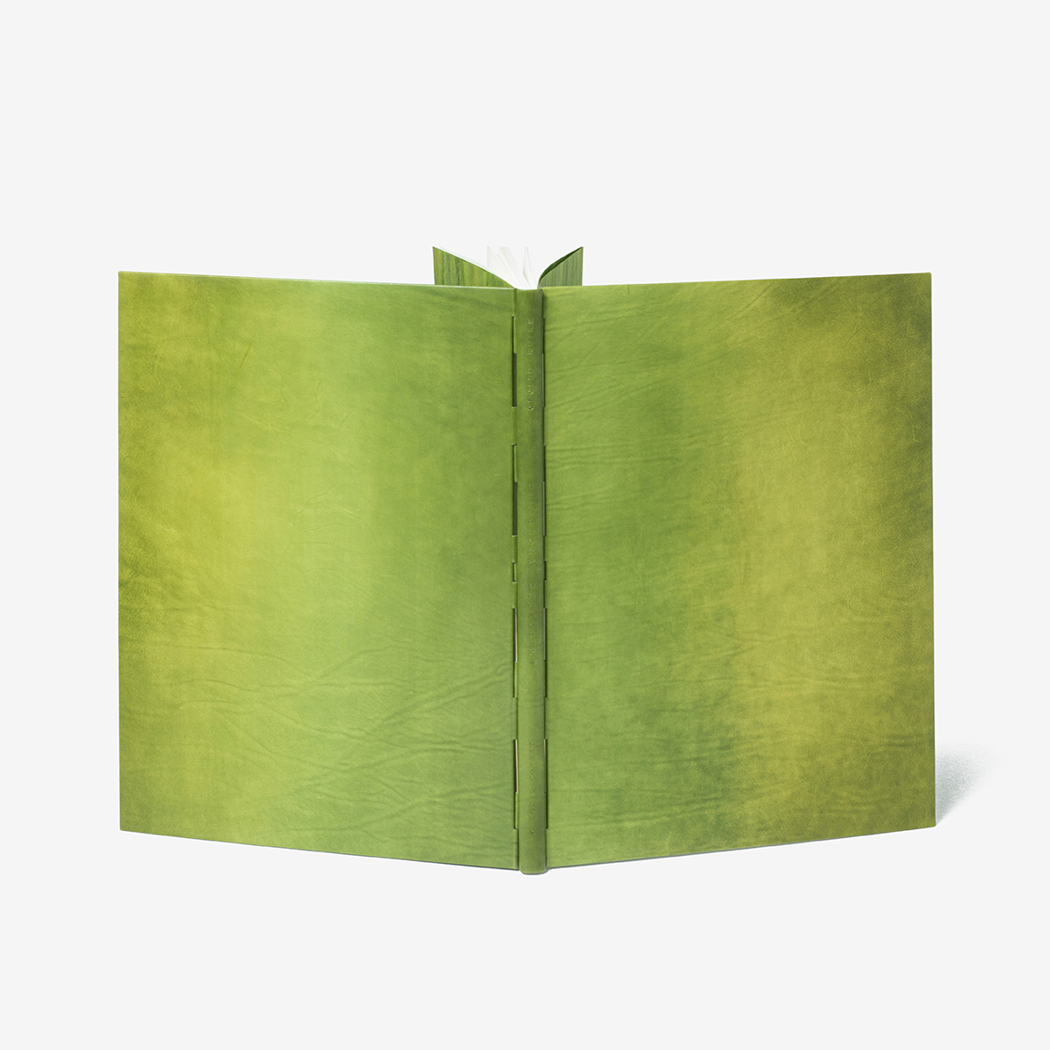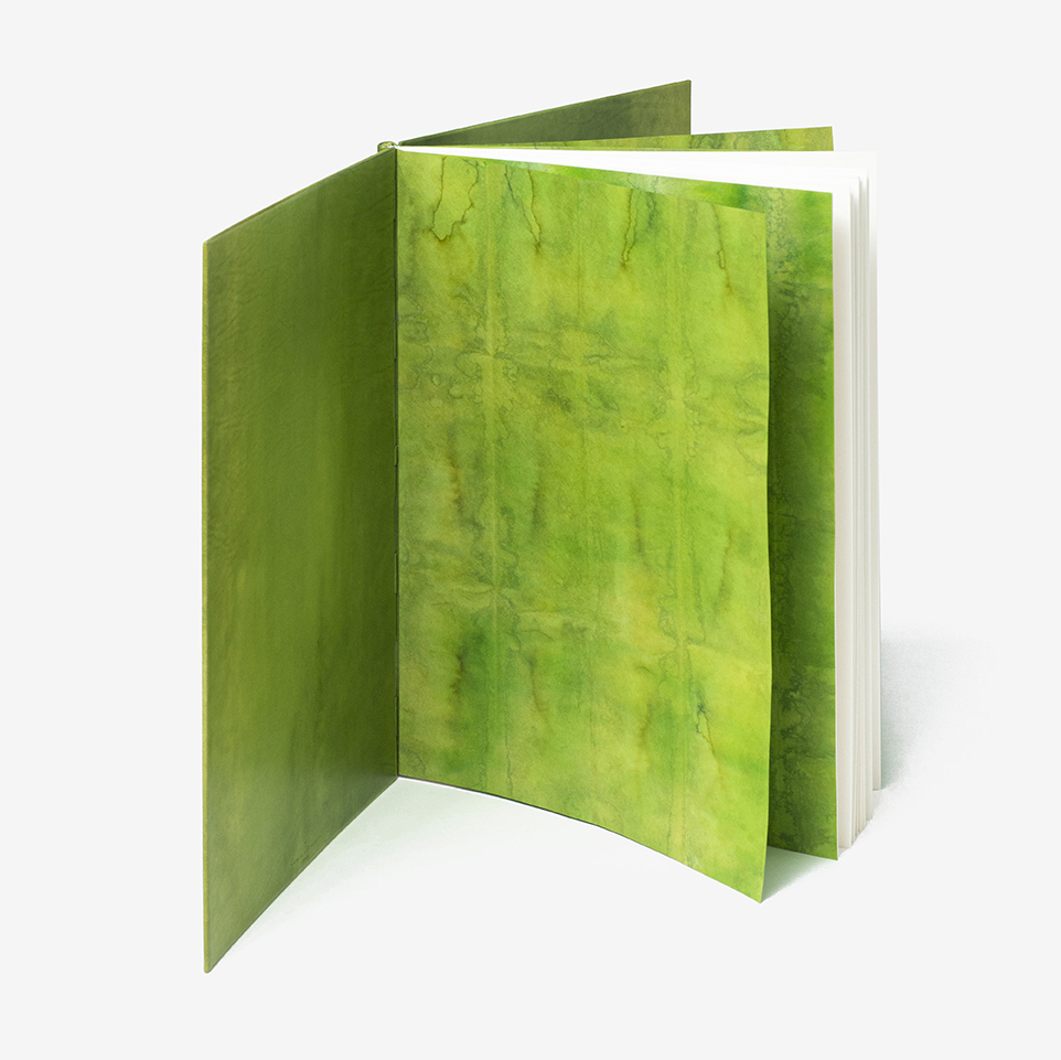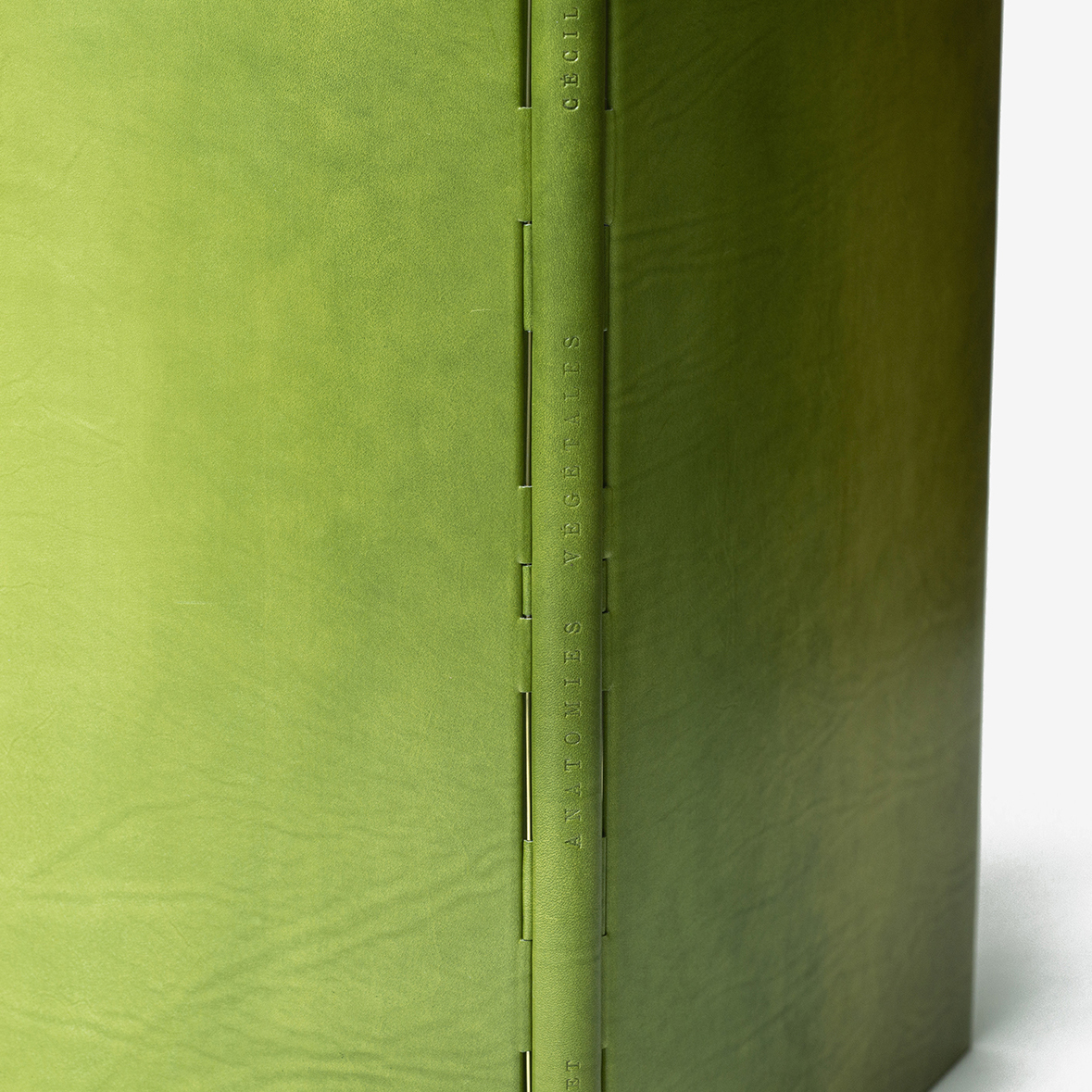 320 x 220 mm. Reliure à tiges, veau aniline blanc, décor peint à l’encre en nuance de vert se prolongeant sur les doublures, tiges de titane, gardes de papier japonais décoré à l’encre. Titrage au froid naturel de Claude Ribal, en long sur le dos (2021).