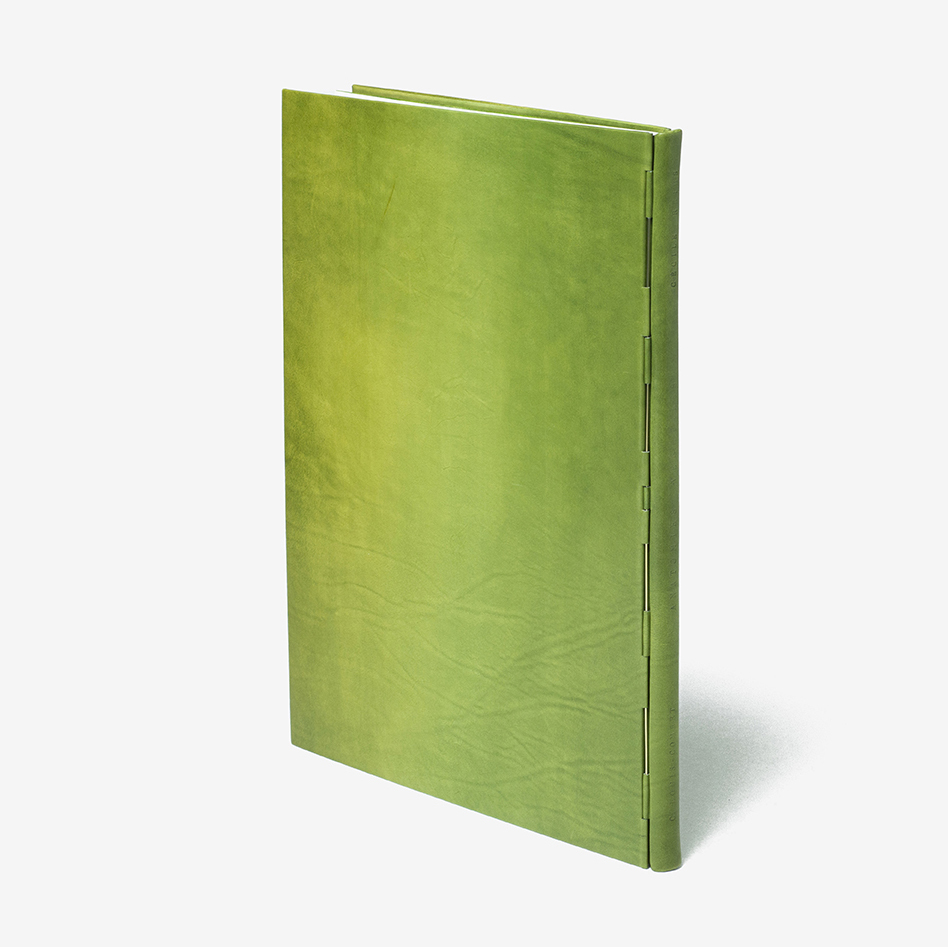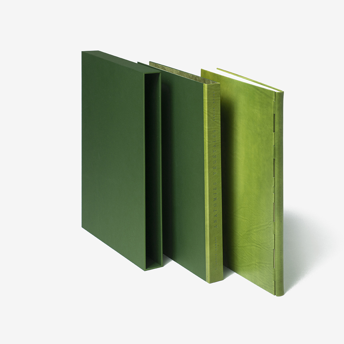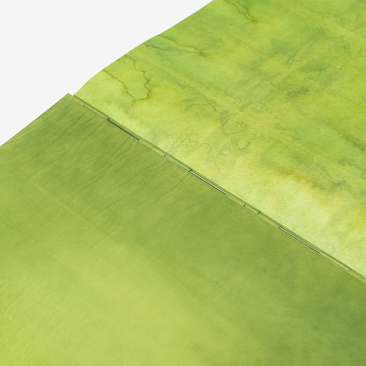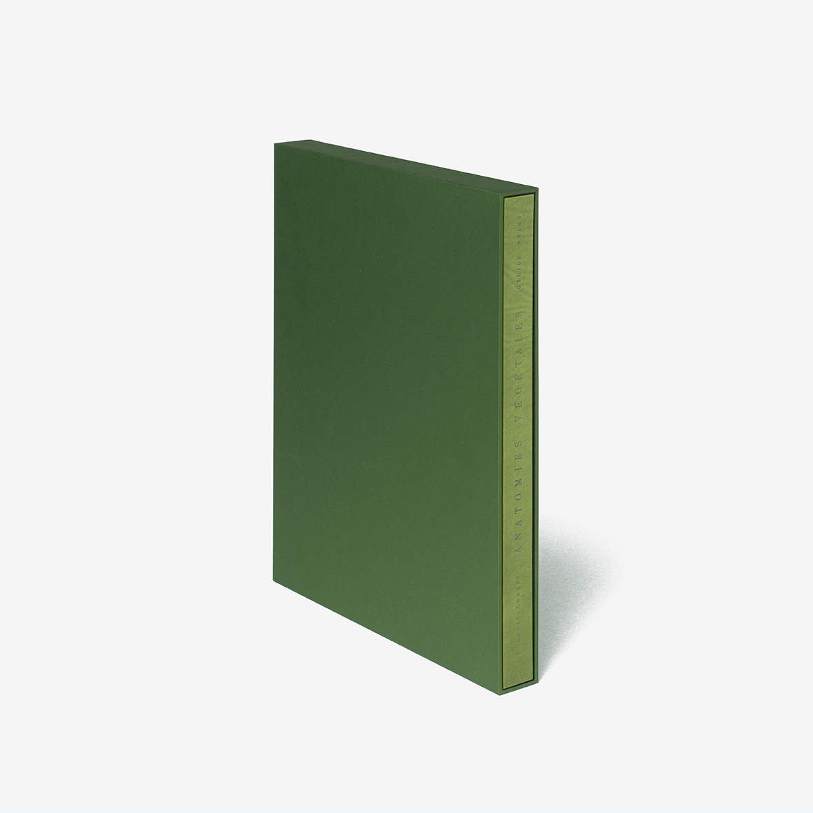 320 x 220 mm. Reliure à tiges, veau aniline blanc, décor peint à l’encre en nuance de vert se prolongeant sur les doublures, tiges de titane, gardes de papier japonais décoré à l’encre. Titrage au froid naturel de Claude Ribal, en long sur le dos (2021).