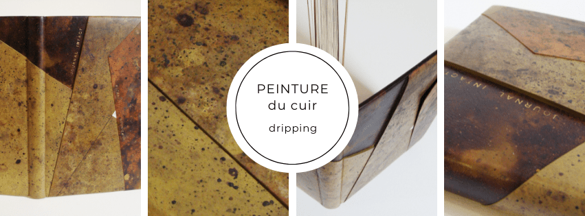 À la manière de Jackson Pollock, cette reliure est décorée par projection de teinture directement sur le cuir.