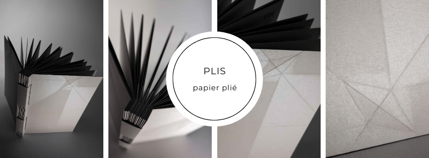 C’est en travaillant sur la reliure de L’Instant du givre d’Hélène Cadou, commande de la médiathèque de Riom en 2018, que, souhaitant évoquer le thème de la trace, j’ai imaginé tirer parti des marques laissées par le pliage du papier, en les considérant comme des compositions graphiques à part entière.